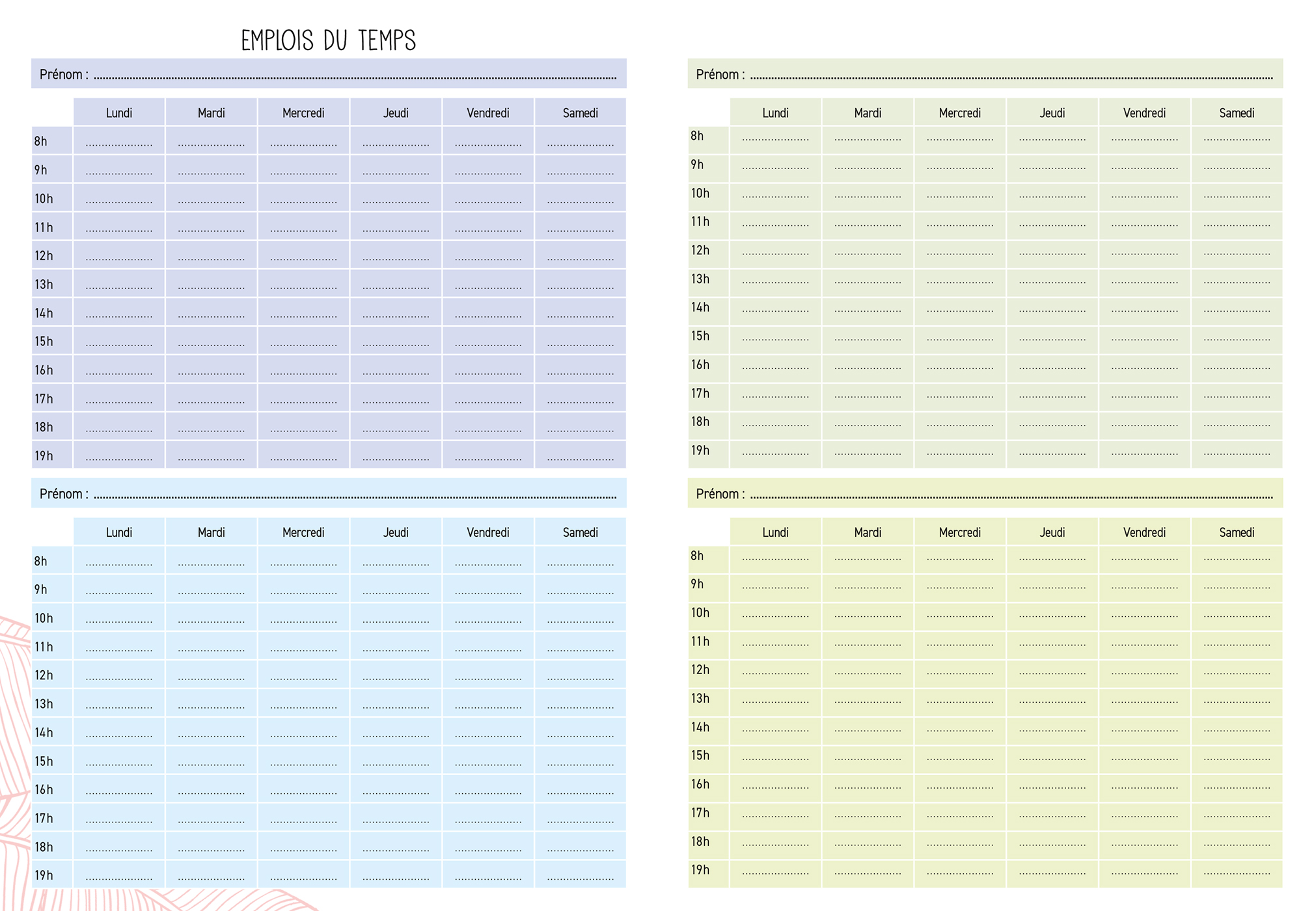 – 6 emplois du temps,