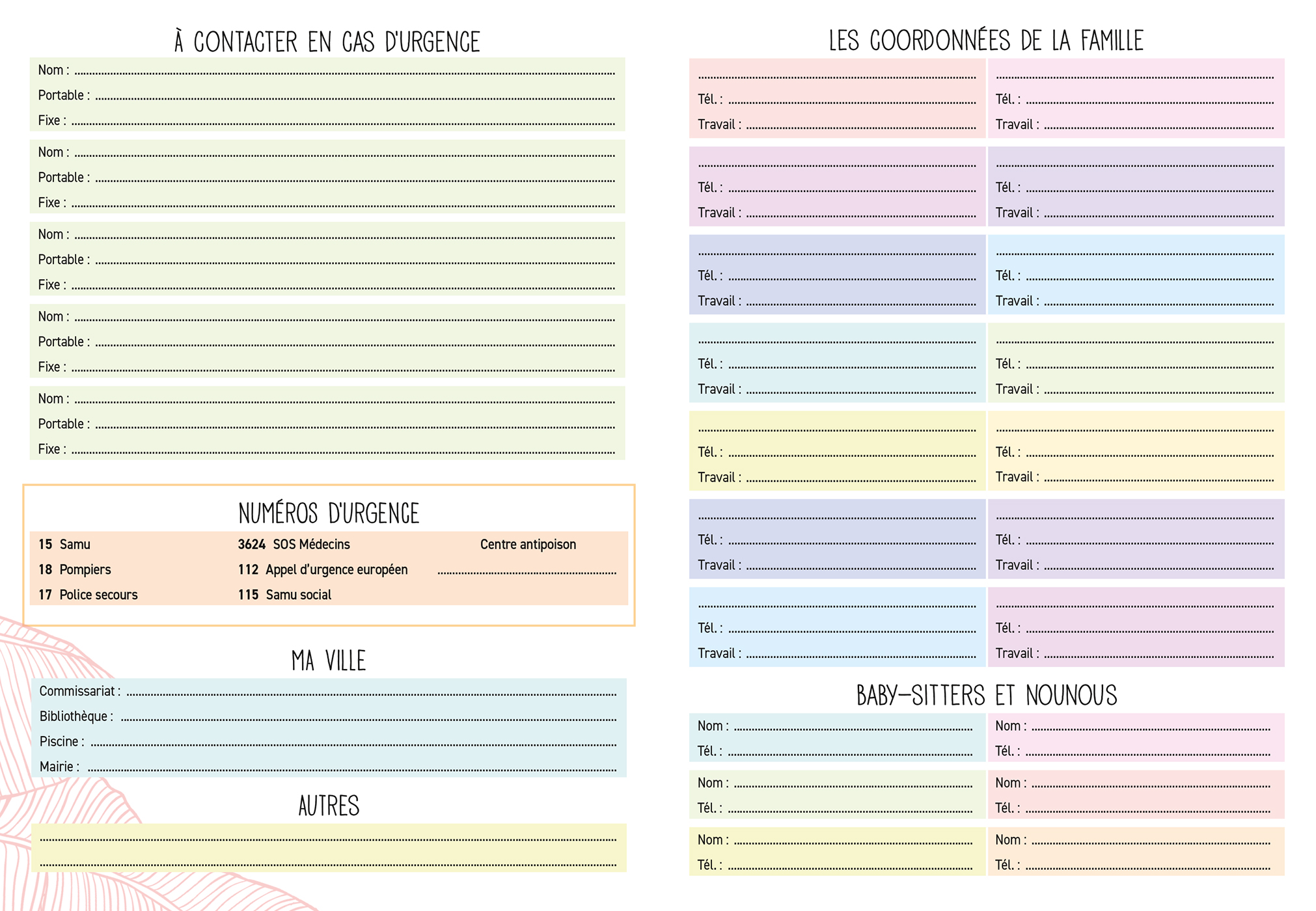 – Les numéros utiles (famille, numéros d'urgence, médecins, copains des enfants…),