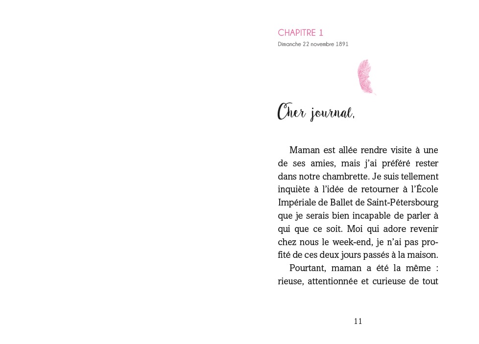 Figure-toi que notre directeur, M. Petipa, a décidé de me donner des cours particuliers, en plus de ceux de l'École de ballet ! Je me demande bien pourquoi… Je passe mes journées à danser, en classe et aussi en catimini avec Igor, Galina, Natalia, Yelena et Irina ! Et si les pestes sont toujours pestes, peu importe : Noël arrive !