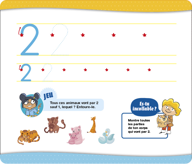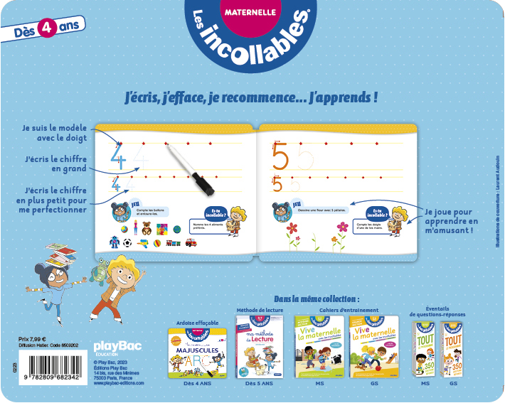 Explore le chiffre avec le doigt, écris-le dans deux tailles différentes, efface et recommence à l’infini ! Sur chaque double-page, découvre également des jeux et des quiz en lien avec les chiffres pour apprendre en t’amusant.