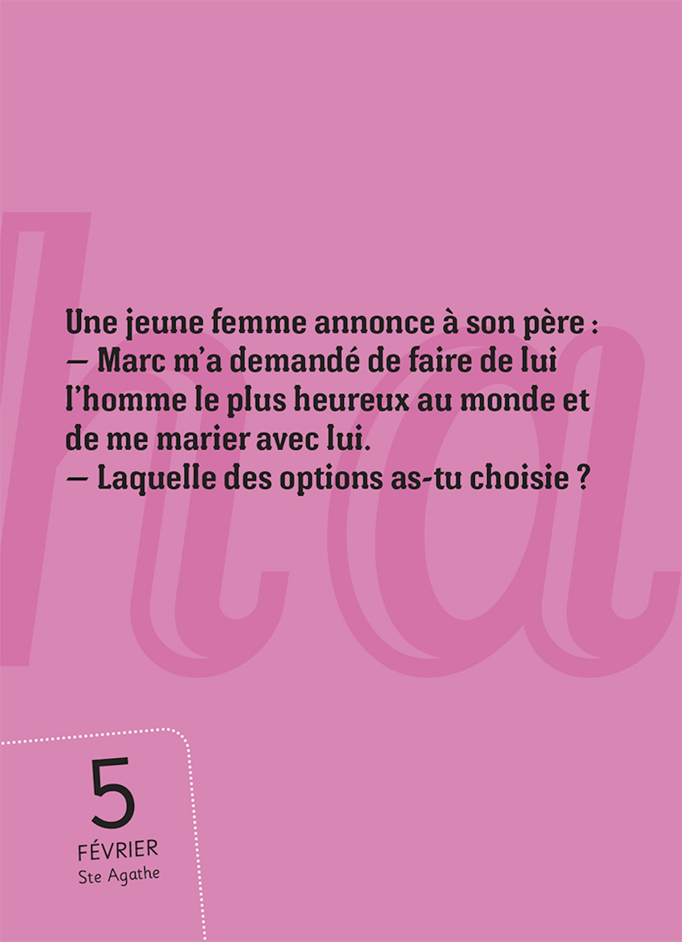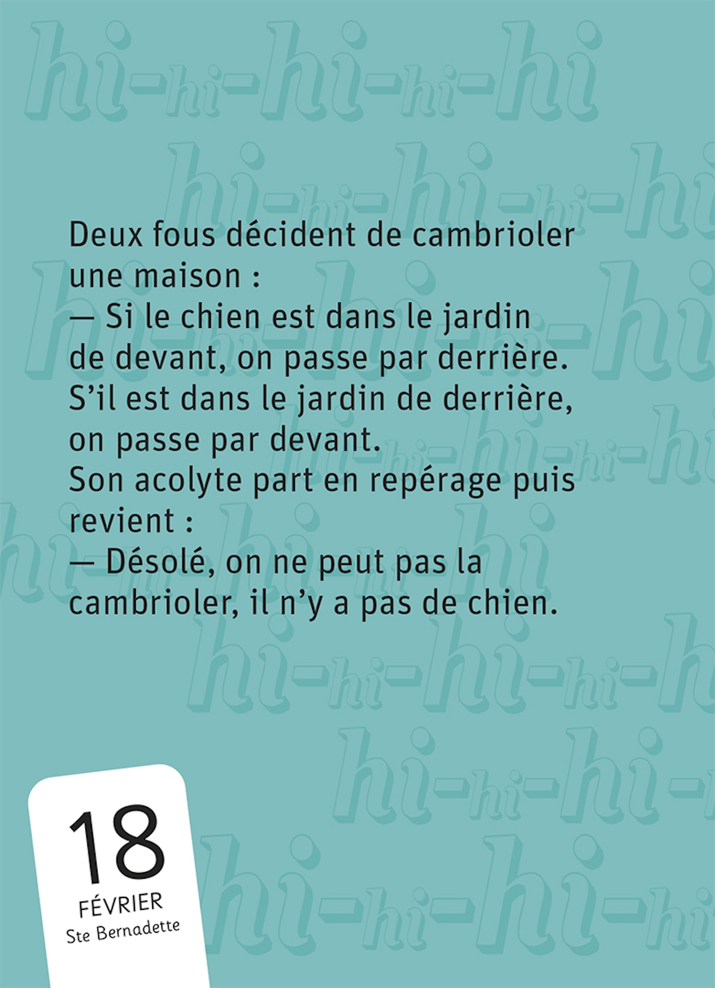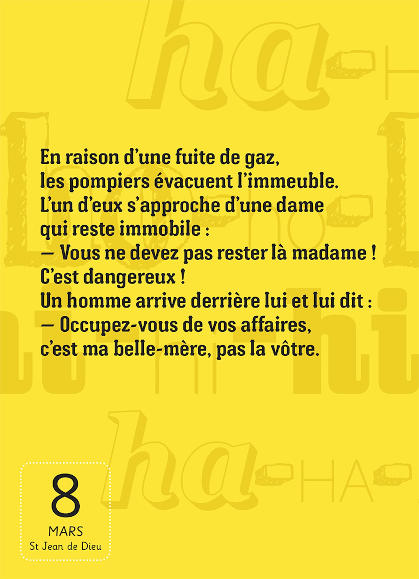 Chaque jour, un fou rire garanti sans colorant ni conservateur : histoires drôles, jeux de mots, humour noir, blagues coquines, répliques loufoques, devinettes et second degré.