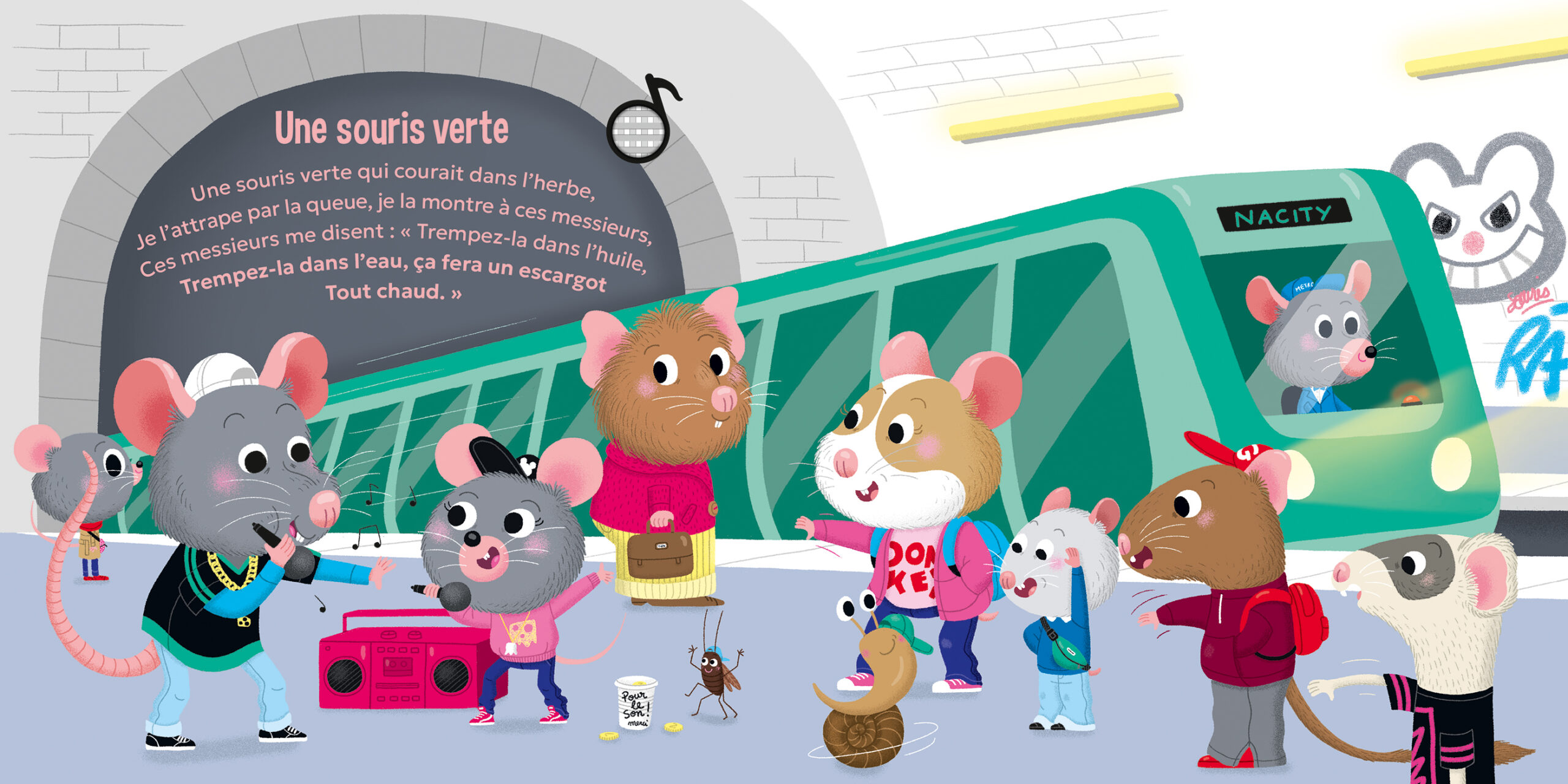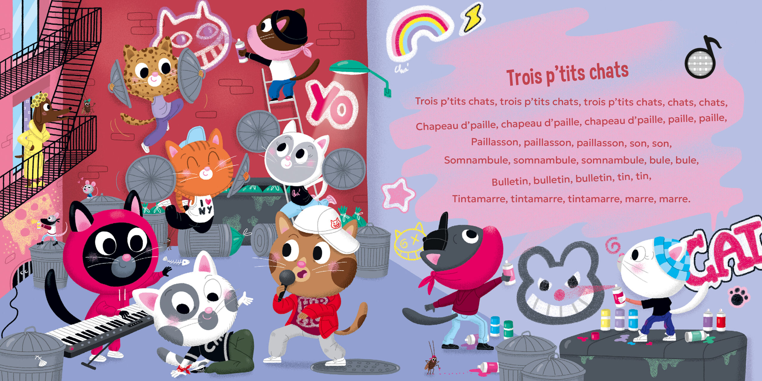 Mes premières comptines revisitées en Hip-Hop pour chanter avec les animaux de la ville ! 5 comptines traditionnelles connues, entièrement ré-enregistrées et ré-interprétées façon hip-hop : Trois p'tits chats ; Une souris verte ; La totomobile; Au feu les pompiers; La mère Michel. Un livre sonore idéal pour faire découvrir le Hip-Hop aux tout-petits, dans un univers drôle et joyeux. Ils peuvent appuyer sur la puce tout seuls pour lancer ou arrêter la musique. Avec un niveau sonore maîtrisé, le livre est parfaitement adapté dès 1 an !