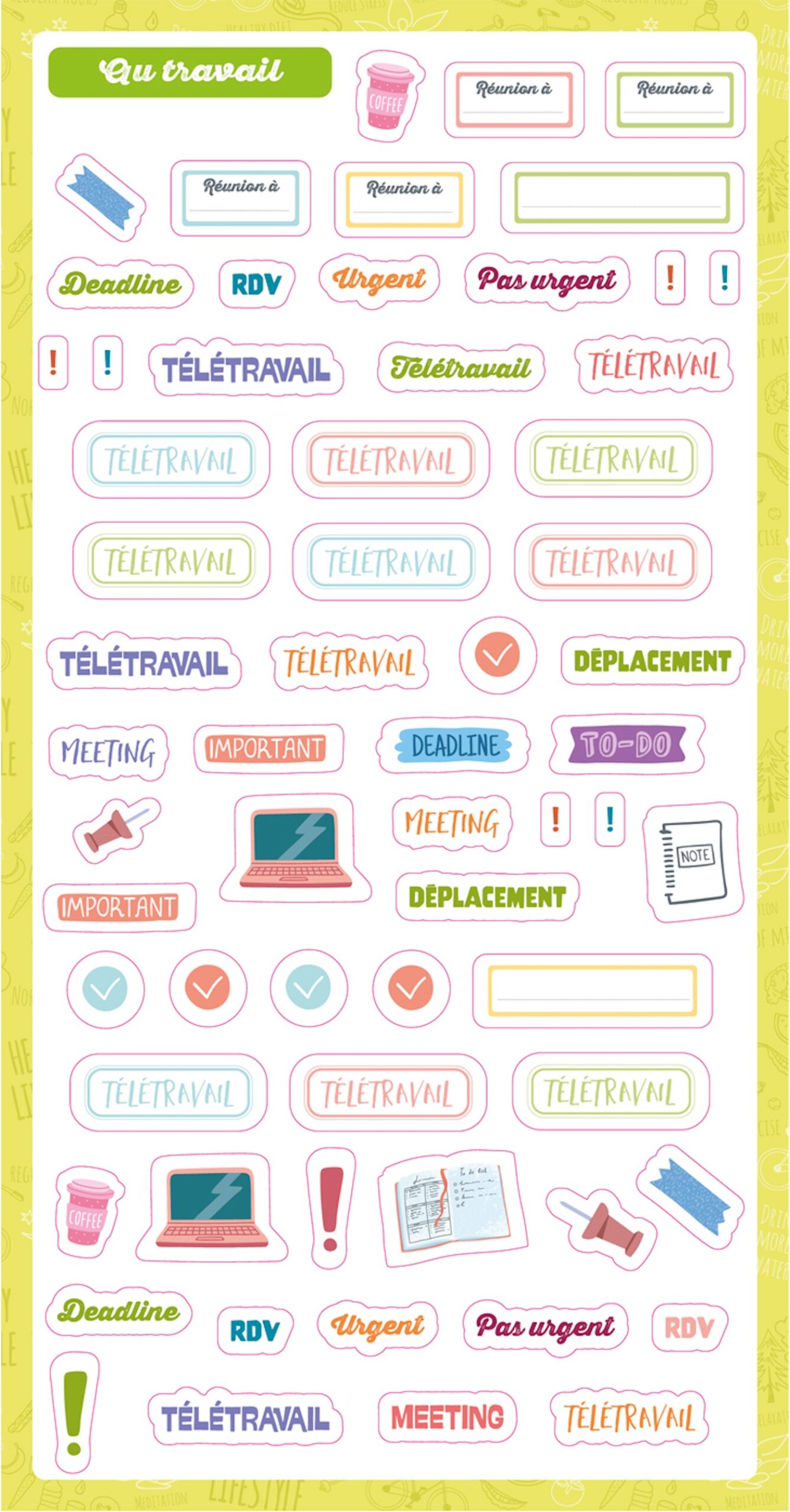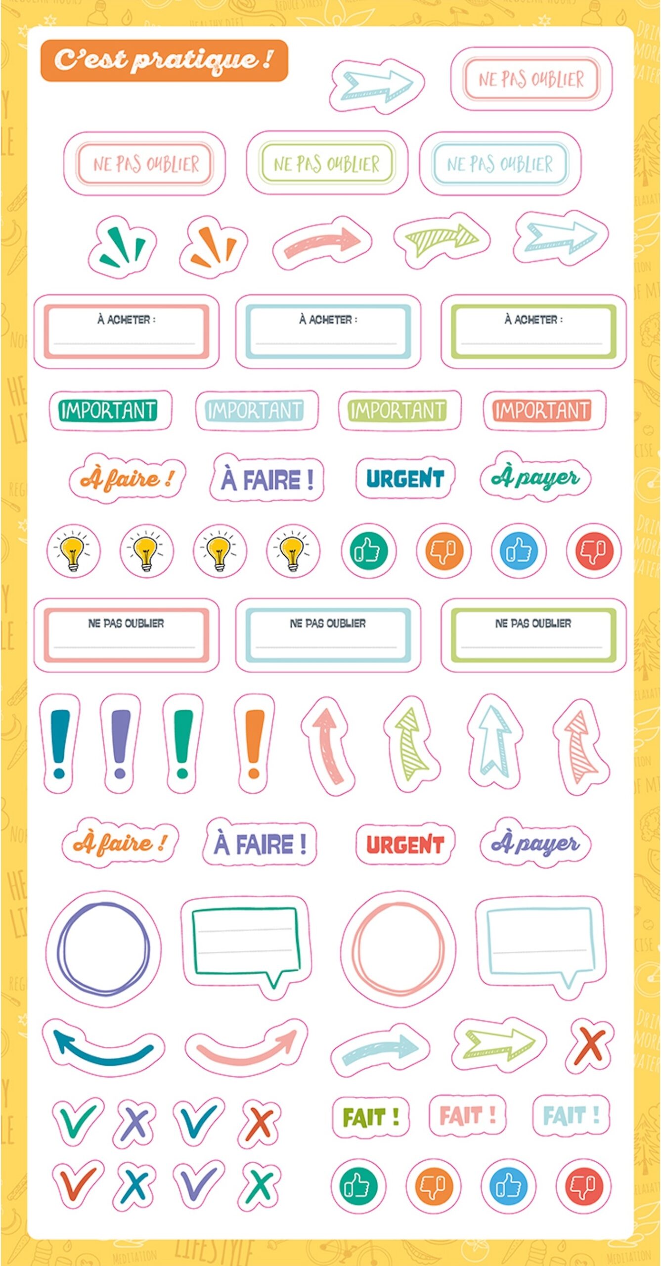 Plus de 600 stickers organisés par catégorie : travail, enfants, anniversaires, sorties et activités… et des stickers à compléter soi-même pour s’adapter à toutes les situations du quotidien.