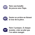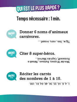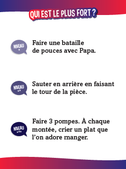 Maman, papa, Anaïs ou Hugo ? Défiez-vous enfants contre parents avec des quiz délirants ! 510 quiz avec : • des questions super marrantes ; • des défis physiques parfois acrobatiques ; • des mimes, des devinettes, des charades… avec des questions adaptées à chaque niveau, facile (CP-CE1-CE2), moyen (CM1-CM2-6e) et difficile (adultes).
