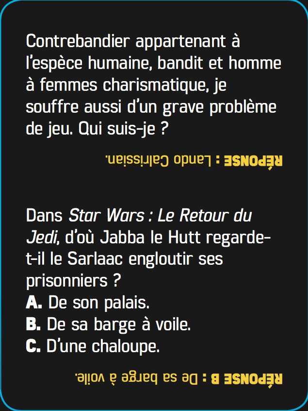 400 quiz et défis sur l’ensemble de la saga Star Wars (inclus l’épisode IX) sous forme de cartes à piocher à volonté. Que la force soit avec vous pour triompher des forces obscures !