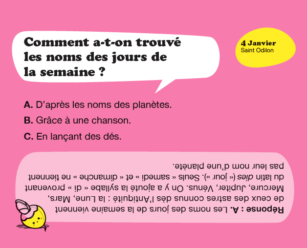 Comment l’eau arrive dans le robinet ? Comment se forme un bleu ? Comment sait-on où est la tête d’un ver de terre ? Comment savoir si j’ai tort ou raison ? Enfin des réponses simples et parfois drôles à toutes les questions des 5 à 8 ans. Une question et une réponse par jour aussi utiles pour les enfants que pour les parents. Le format chevalet permet de garder son calendrier ouvert sur son bureau.