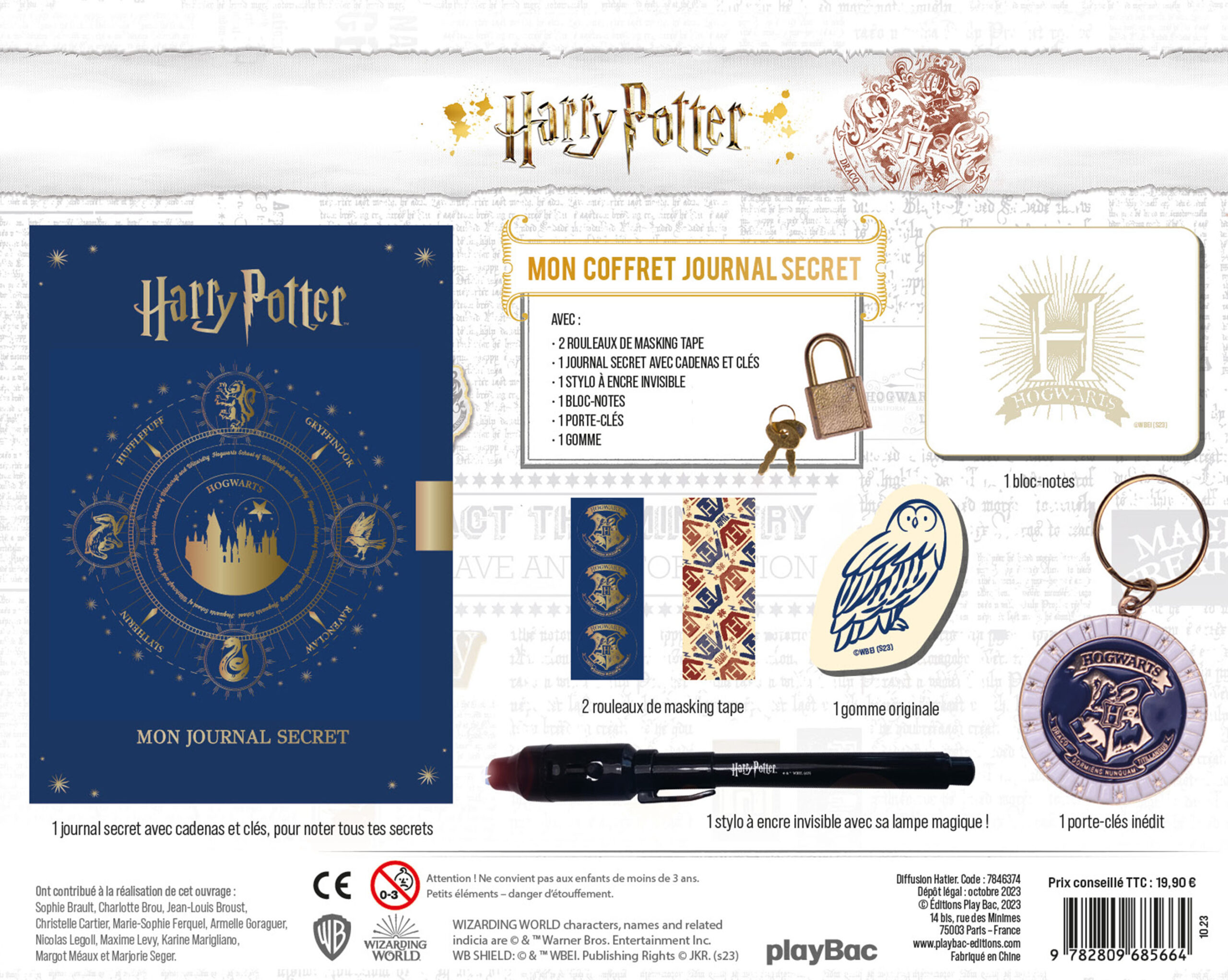 Le coffret contient un journal secret avec du doré sur la couverture, un cadenas et des clés dorés pour mettre ses secrets à l'abri ; un stylo magique qui écrit avec une encre invisible, qui se révèle uniquement si elle est éclairée par la lampe incrustée dans le capuchon du stylo ; un superbe porte-clés doré ; une adorable gomme à l'effigie de la chouette Hedwige et deux rouleaux de masking-tape avec de jolis motifs Harry Potter pour décorer les pages du journal ; un bloc-notes pour noter des petits mots.