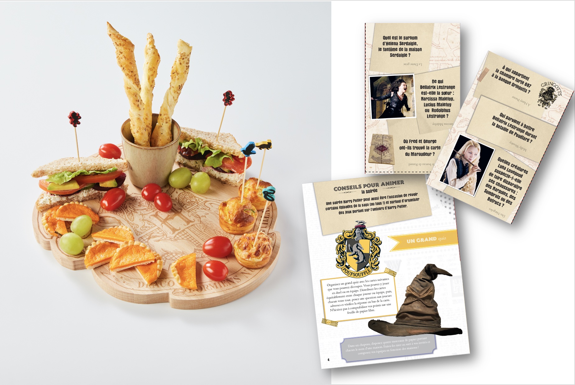 Fans d'Harry Potter et des sorciers de Poudlard ? Ce grand coffret va transformer votre soirée en un moment unique et vous projeter au coeur de votre saga préférée ! Grâce à la très belle planche de dégustation en bois, aux piques décorées aux couleurs des 4 écoles de Poudlard et aux quiz du livret, plongez dans l'univers fantastique d'Harry Potter pour une soirée mémorable.