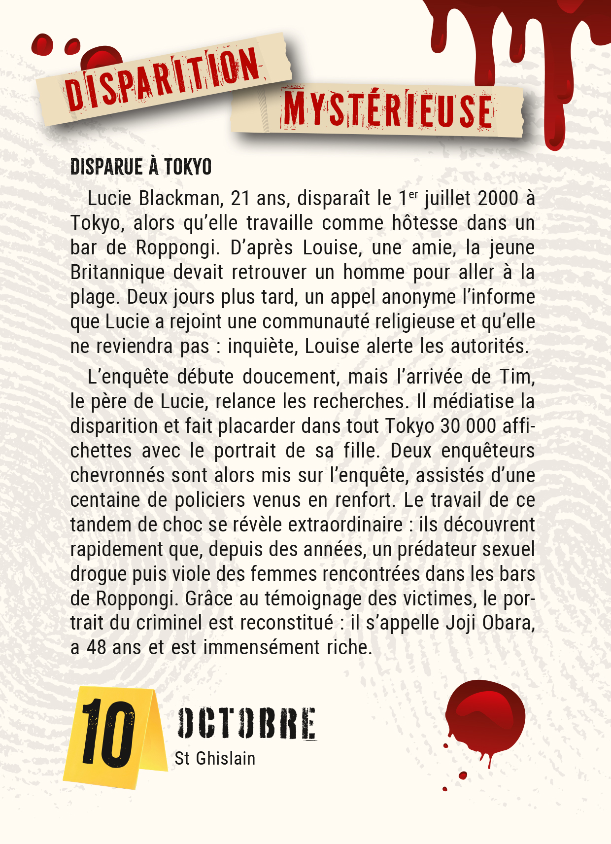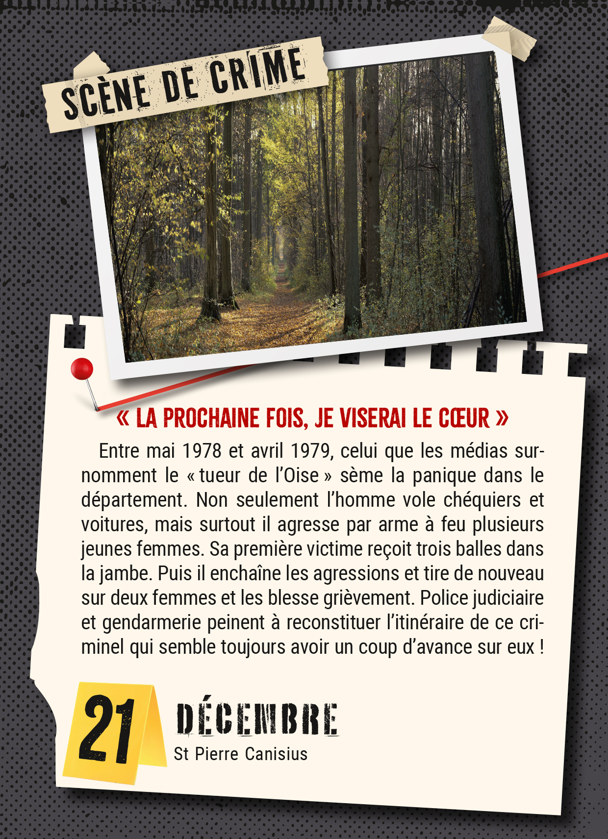 Plongez au coeur de l'univers sombre du crime : portraits saisissants de tueurs en série, faits divers angoissants, anecdotes de procès, scènes de crimes à glacer le sang, et disparitions mystérieuses.