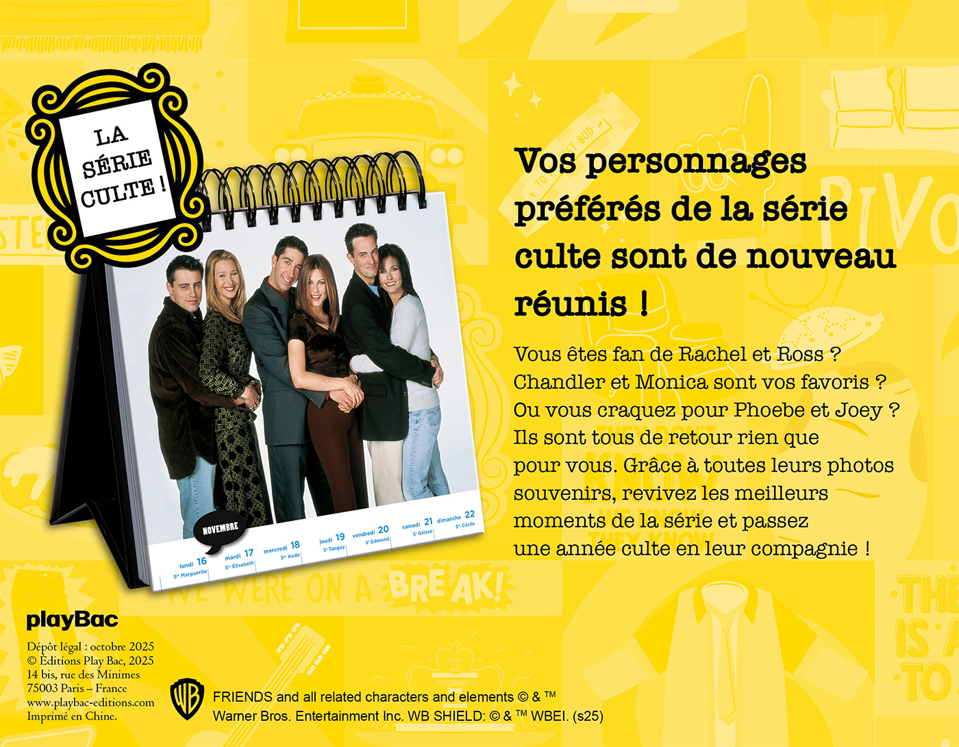 Vous êtes fan de Rachel et Ross ? Chandler et Monica sont vos préférés ? Ou vous craquez pour Phoebe et Joe ? Ils sont tous de retour pour vous faire revivre, chaque semaine, les meilleurs moments de la série dans ce calendrier photos 2024 à poser sur son bureau grâce à son chevalet !