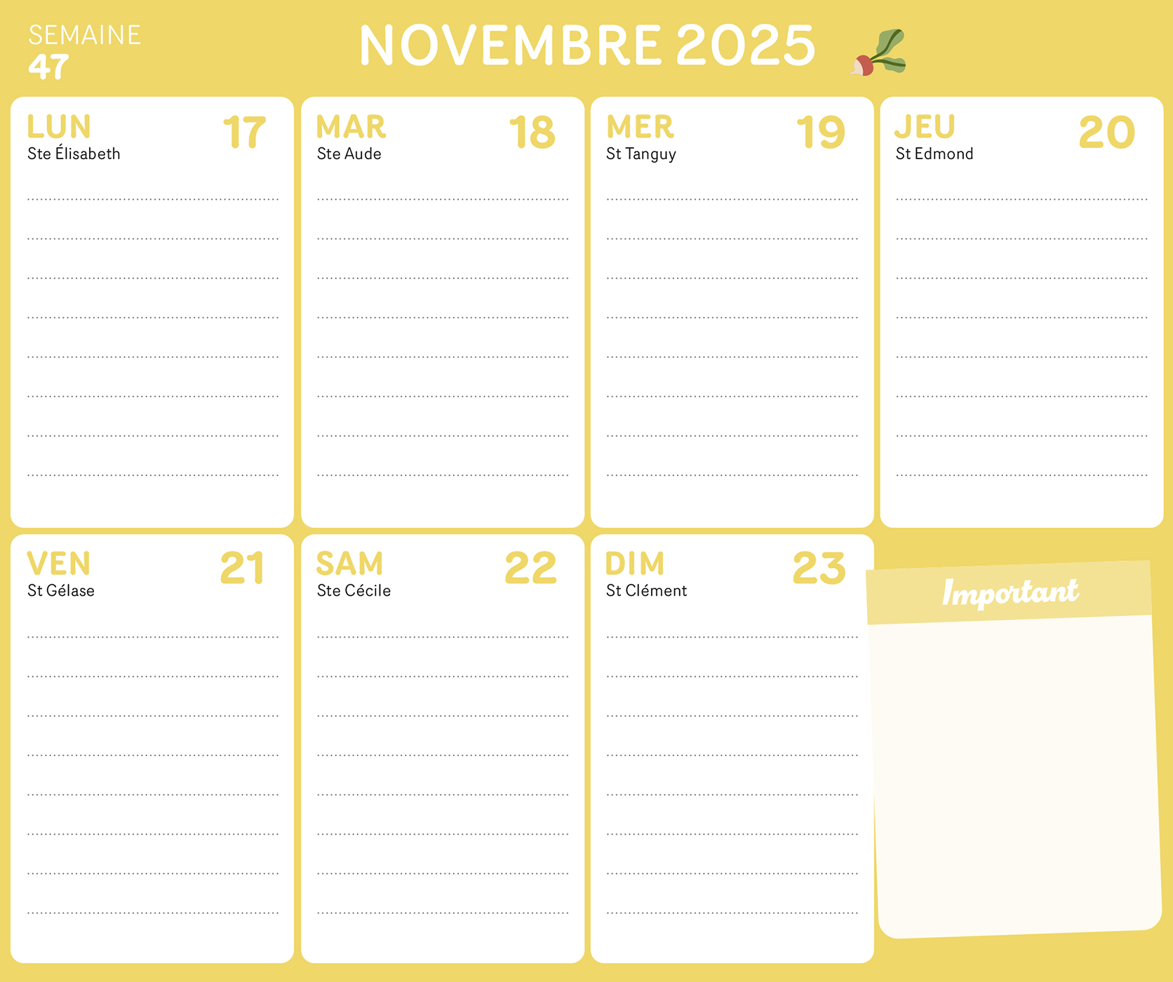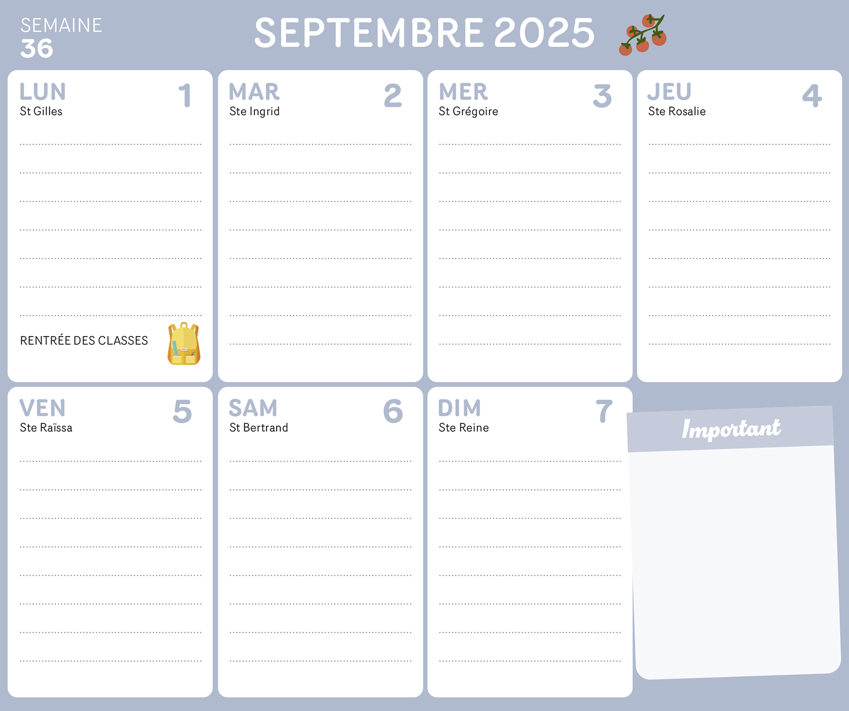 Au recto, le planning d'organisation par semaine permet de noter tous les évènements de votre vie de famille.