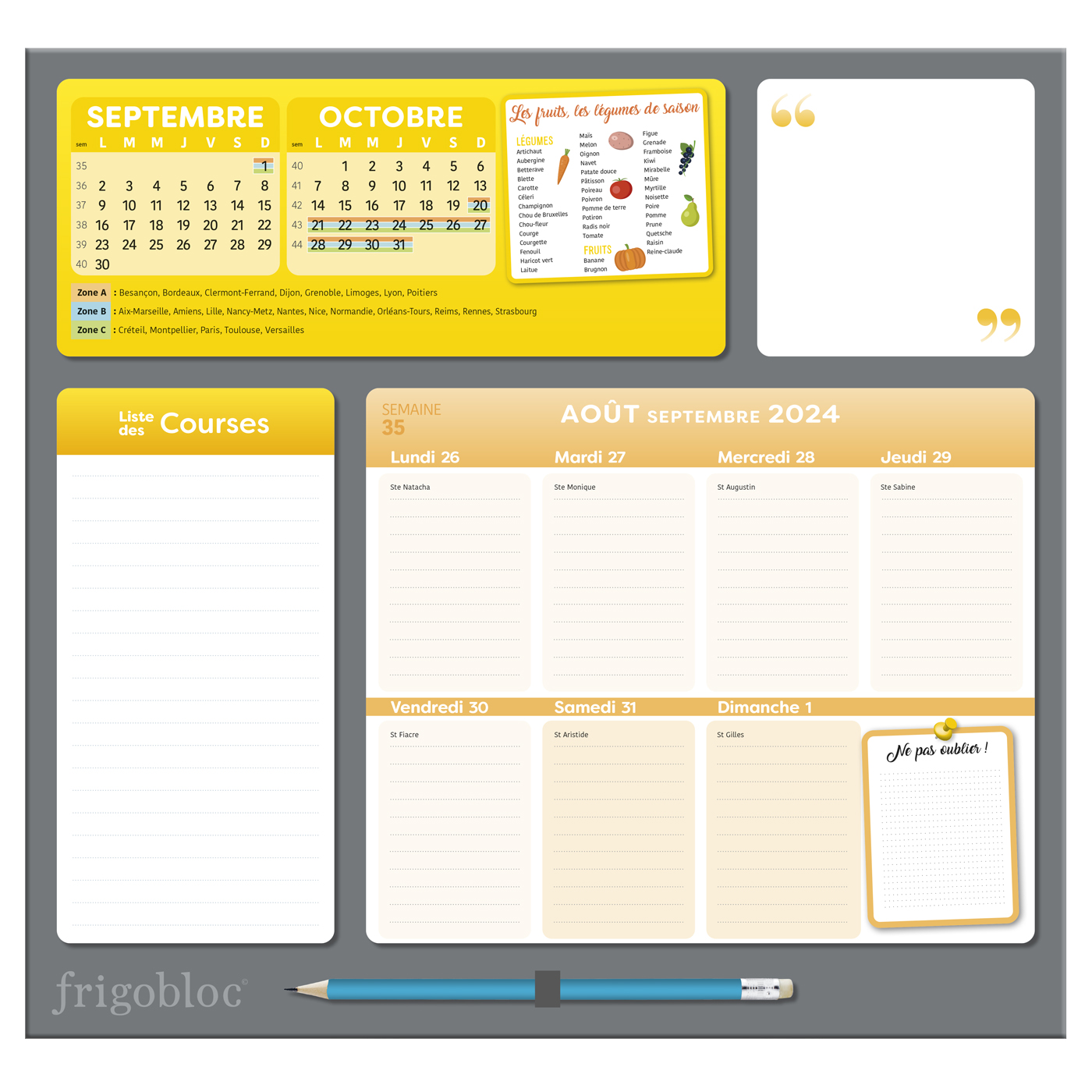 Pour trouver une librairie où acheter Frigobloc Hebdomadaire 2025 – Calendrier d’organisation familiale / sem (de sept. 2024 à déc. 2025), on vous invite à visiter le site Place des libraires !Place des Libraires