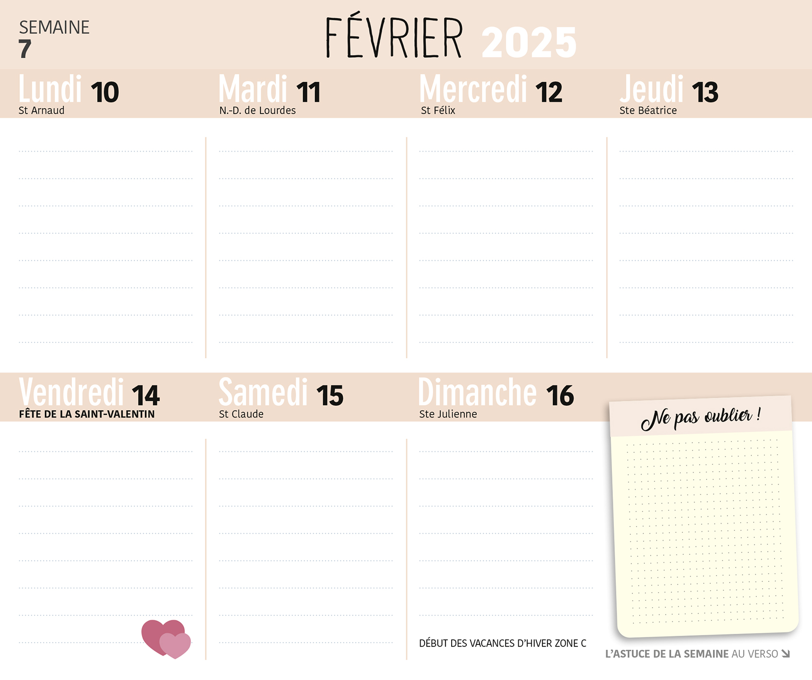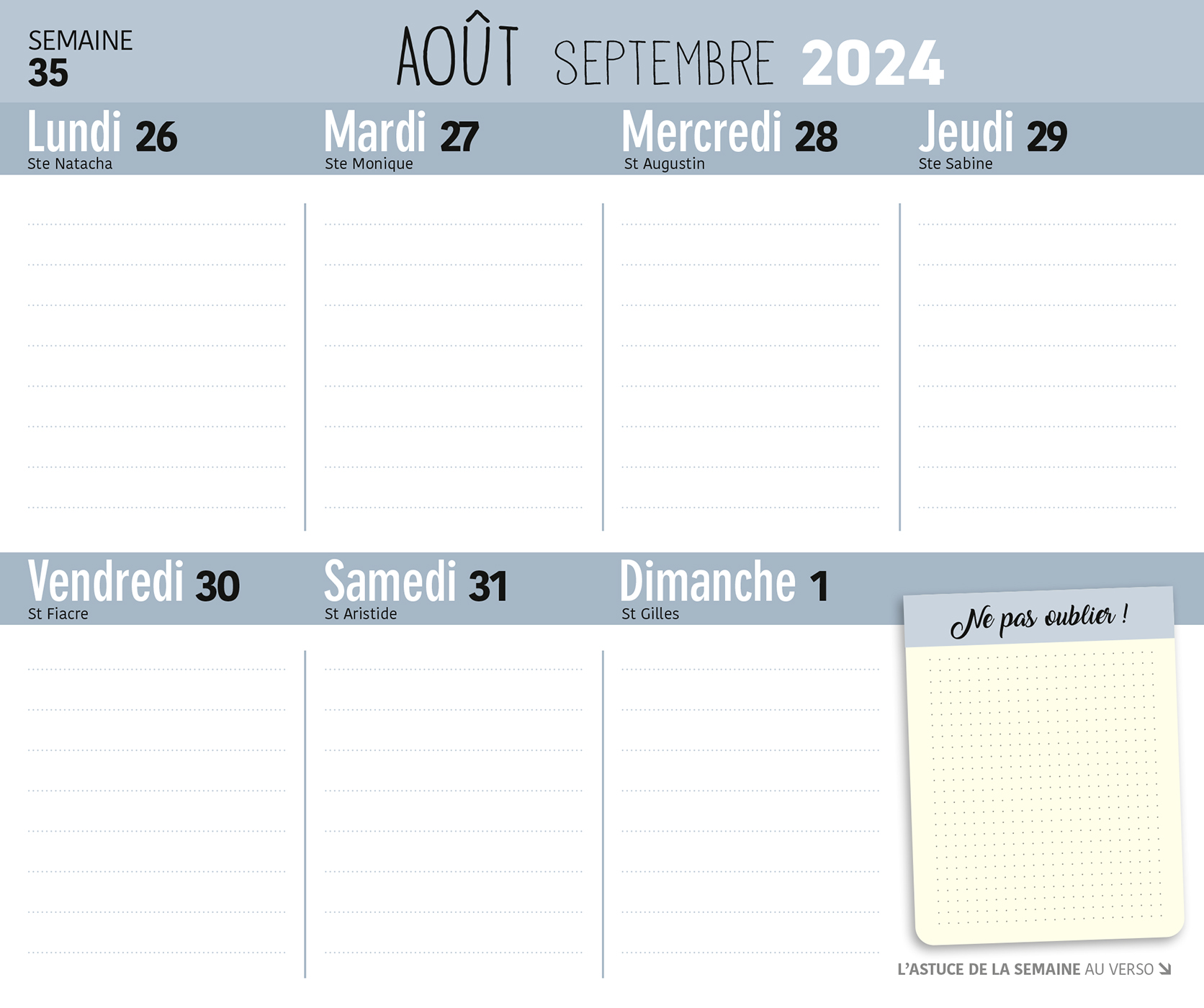 Au recto, le planning d'organisation par semaine permet de noter tous les événements de votre vie de famille. Au verso, 70 pages de conseils pour avoir une maison bien aménagée, bien organisée et bien décorée, pour améliorer votre qualité de vie et votre bien-être au quotidien.