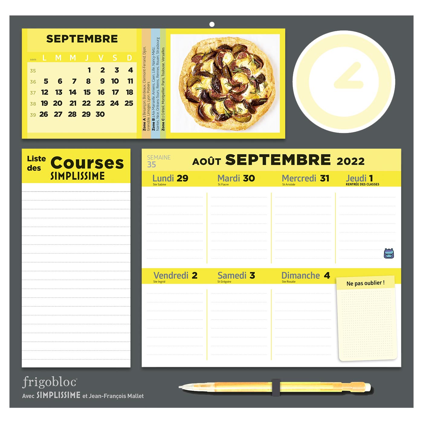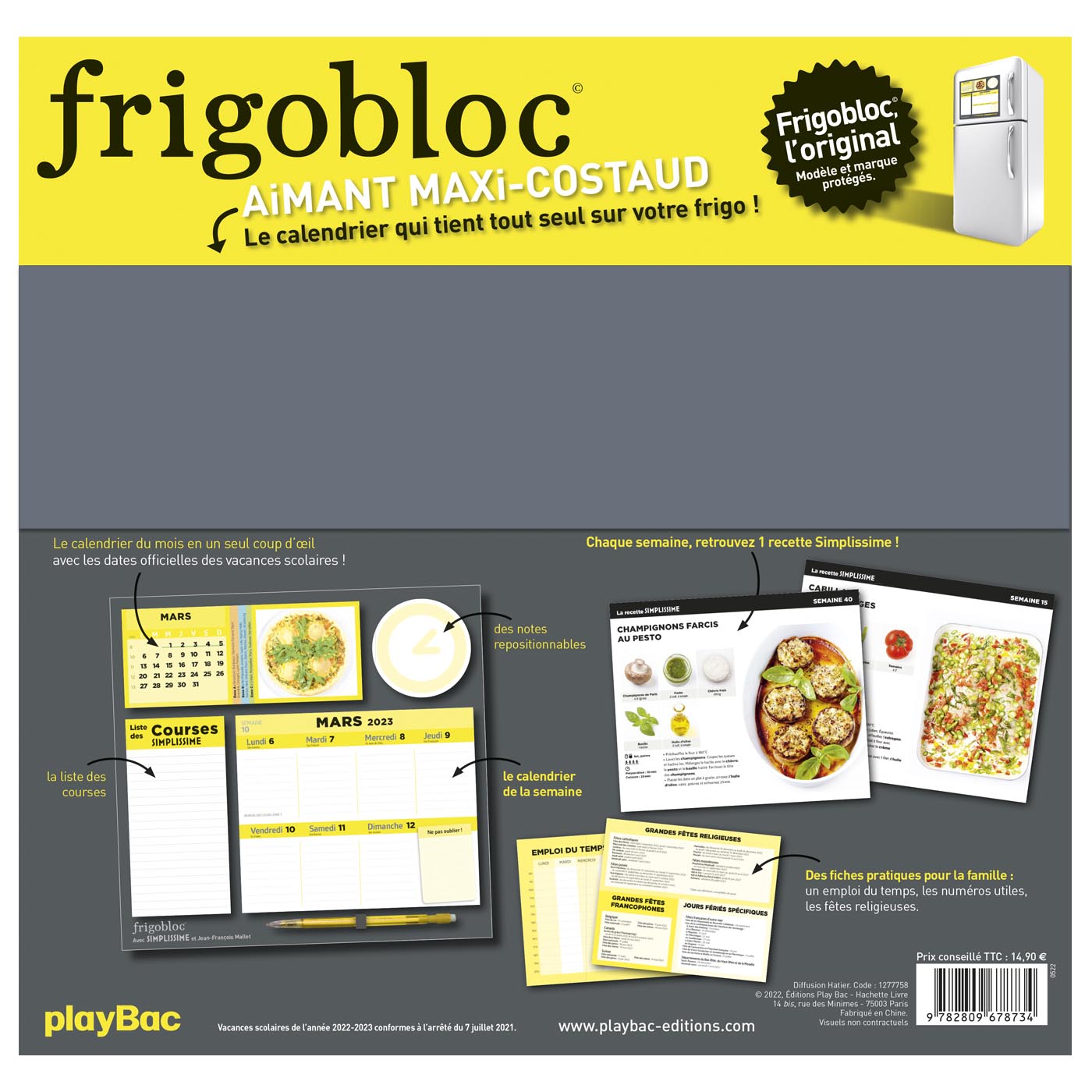 Avec ce calendrier maxi aimanté qui tient parfaitement sur tous les frigos (aimant renforcé), planifiez votre vie de famille de septembre 2022 à décembre 2023 et restez inspirés en cuisine avec Simplissime ! Au recto, le planning d’organisation par semaine permet de noter tous les événements de votre vie de famille. Au verso, des recettes simples à réaliser en un clin d’oeil à la manière du best-seller Simplissime. Avec en bonus 1 bloc liste de courses, 1 bloc post-it et 1 bloc calendrier du mois illustré d’une recette.