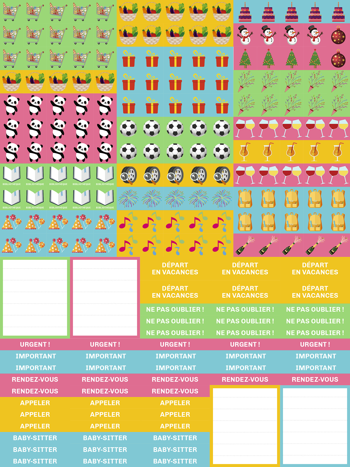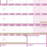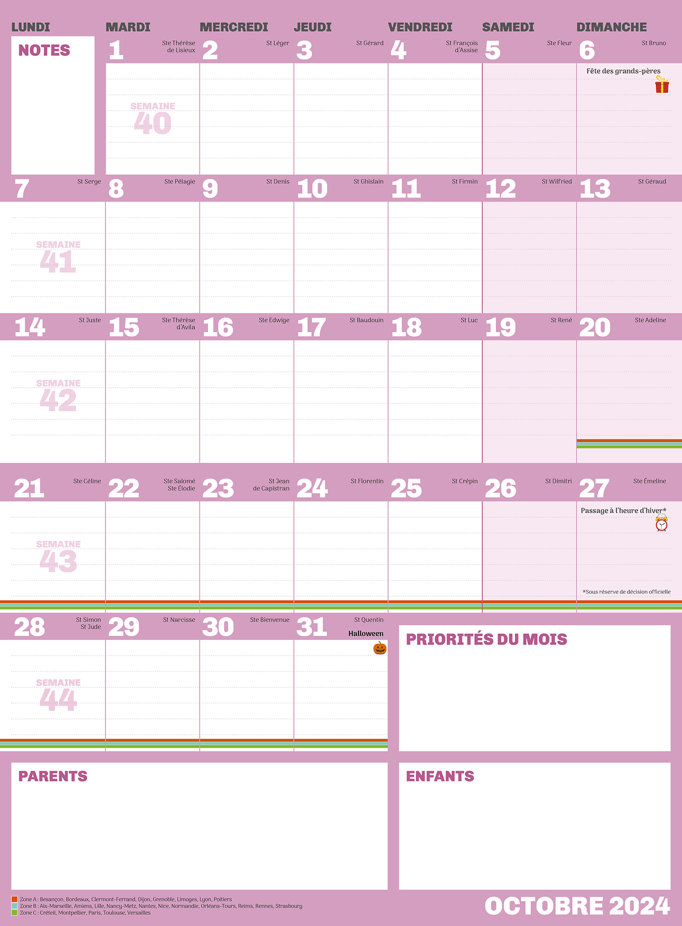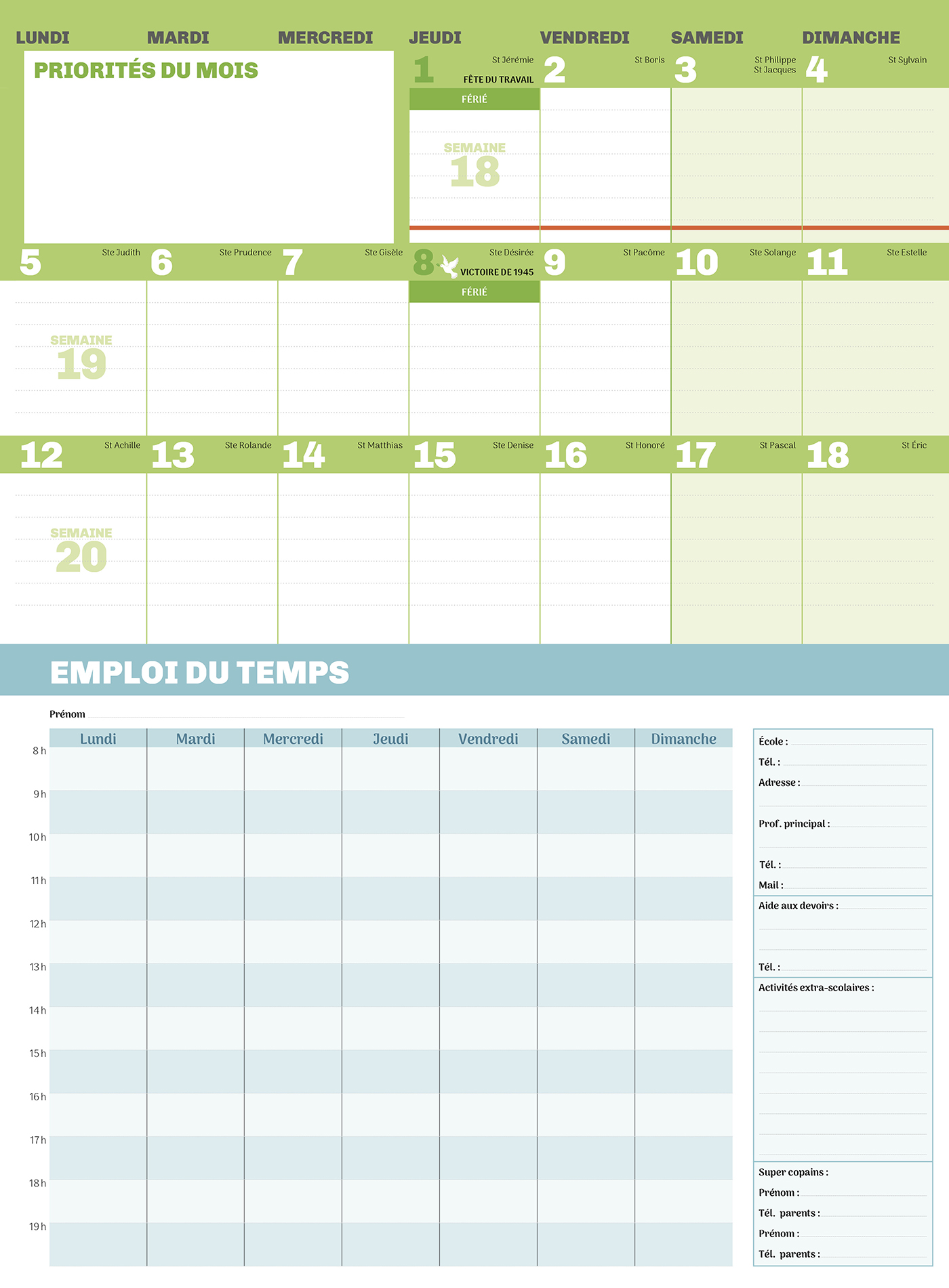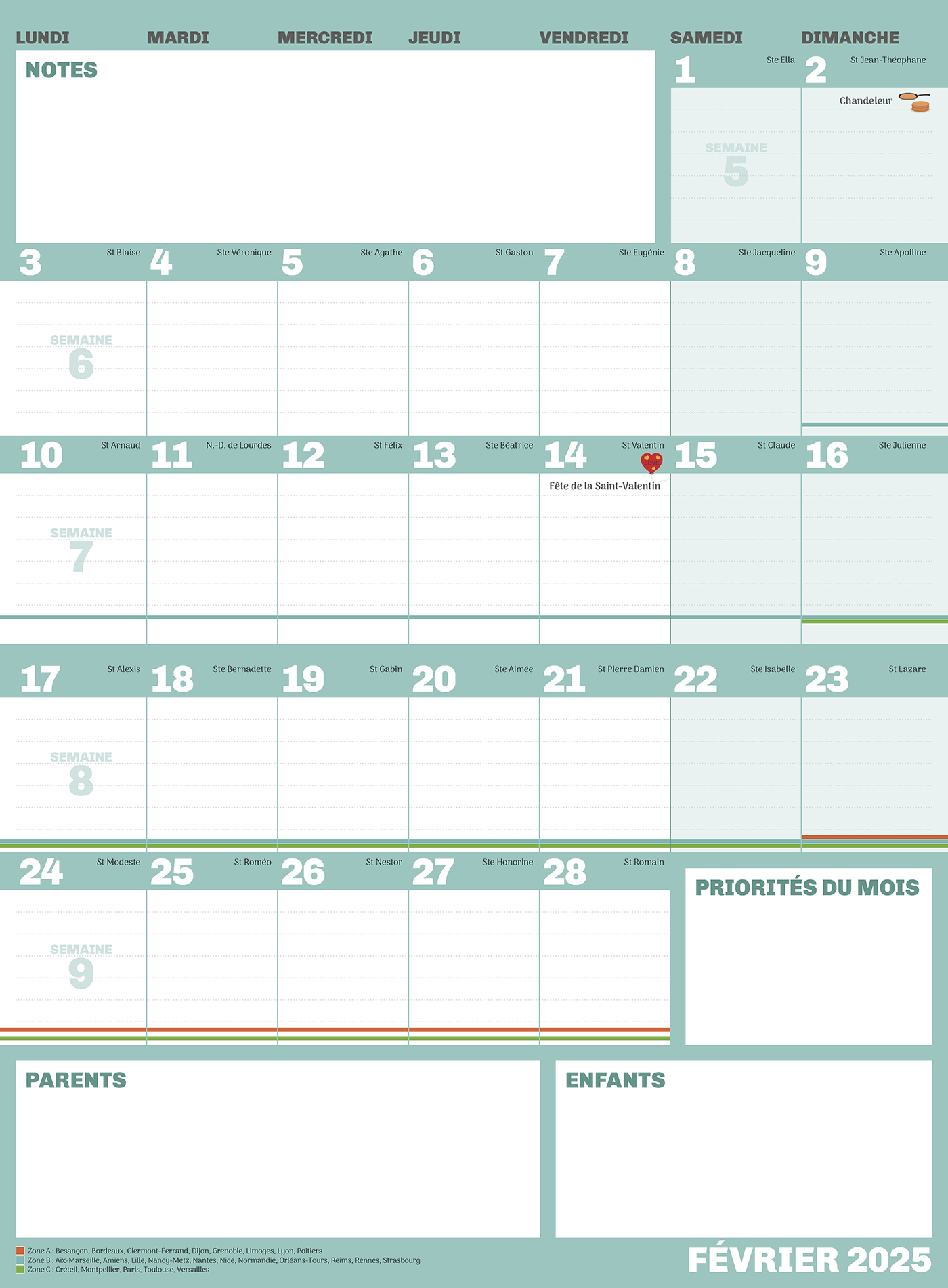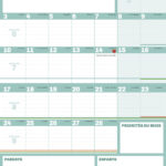 2 pages par mois, de très grandes cases pour tout noter, un espace dédié aux priorités du mois, une zone mémo pour les parents, une zone mémo pour les enfants… l'essentiel et c'est tout !