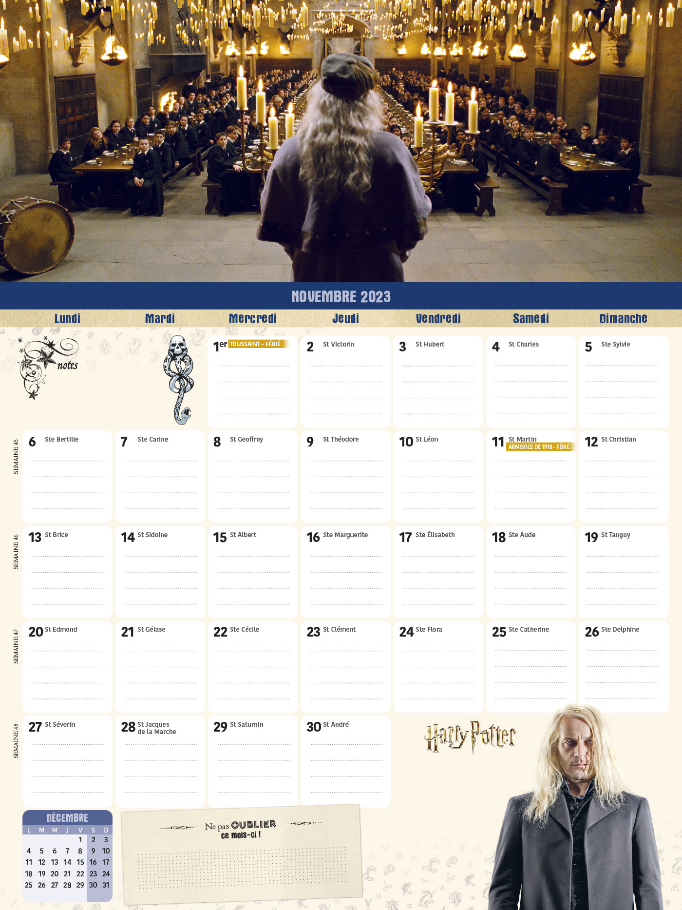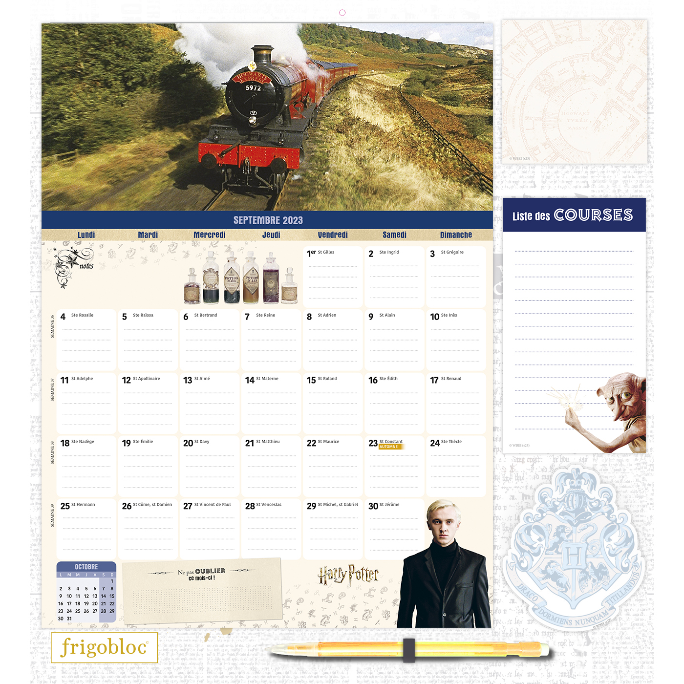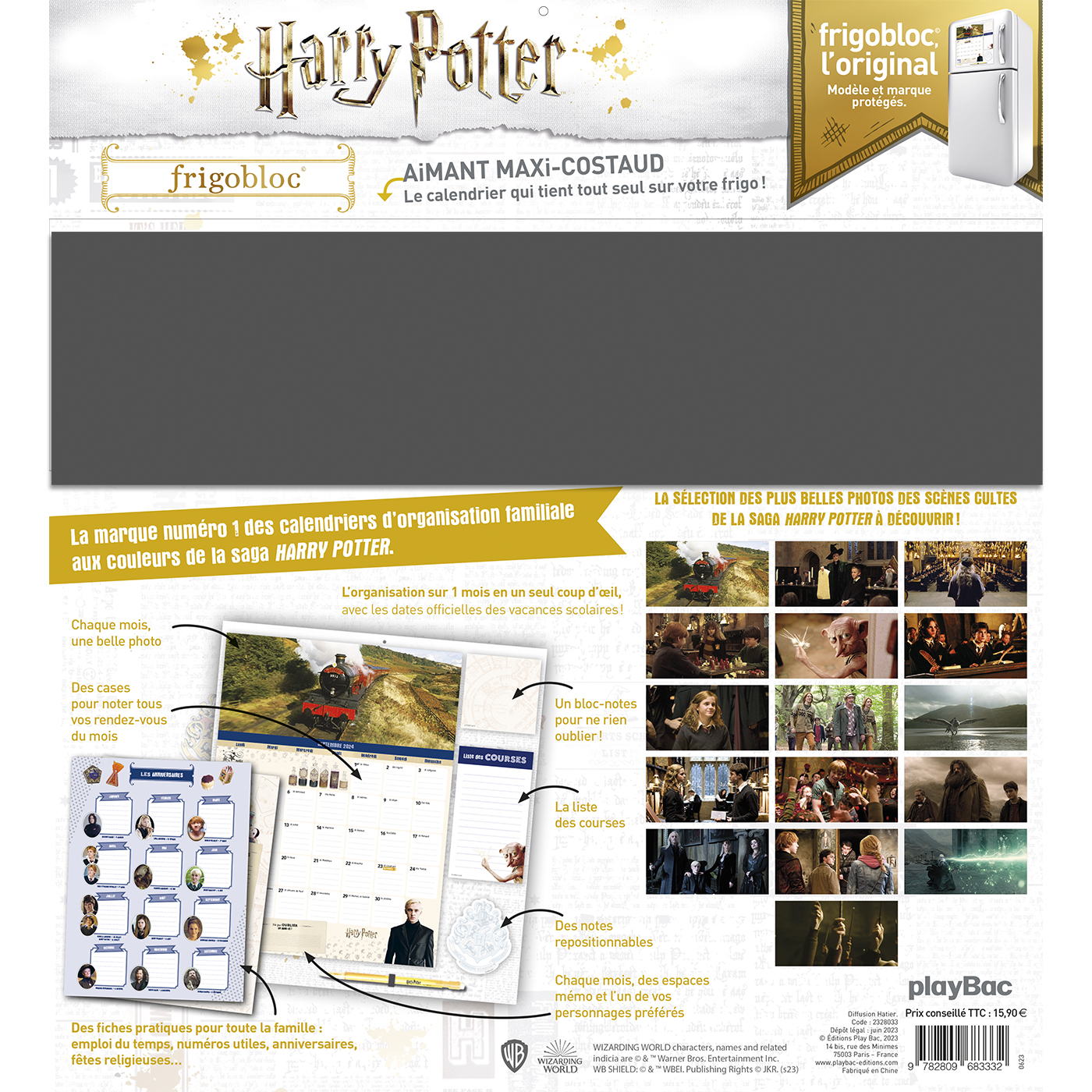 Avec ce calendrier Frigobloc spécial Harry Potter, maxi solide  qui tient parfaitement sur tous les modèles de  frigos grâce à son maxi aimant, planifiez tout sur 16 mois, de septembre  2023 à décembre  2024. Le planning d'organisation par mois permet de tout noter et de ne rien rater de la vie familiale, et chaque mois, retrouvez une belle et grande photo issue des scènes les plus mythiques des films Harry Potter.