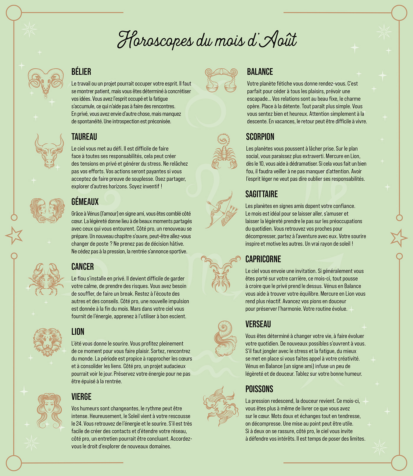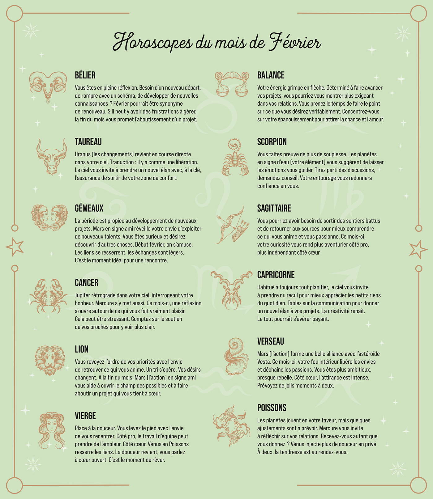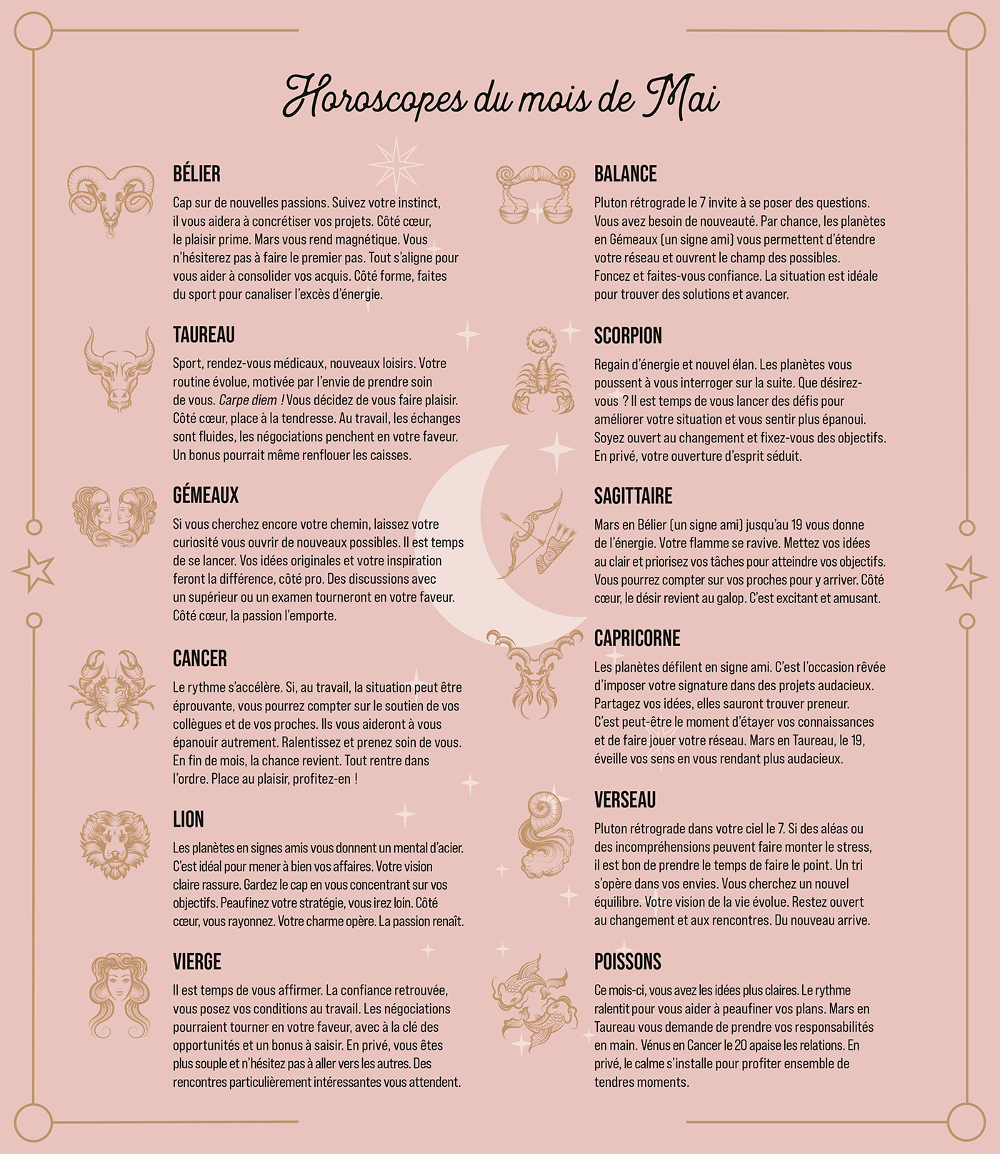 – Des fiches explicatives : le portrait des signes astrologiques, l'influence des planètes, les pouvoirs de la Lune, comprendre Mercure rétrograde…