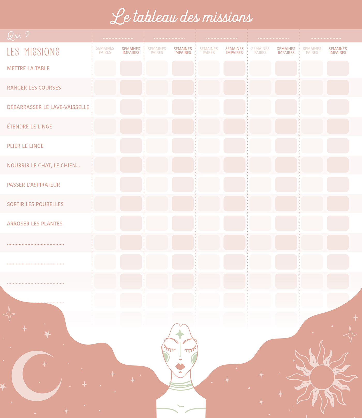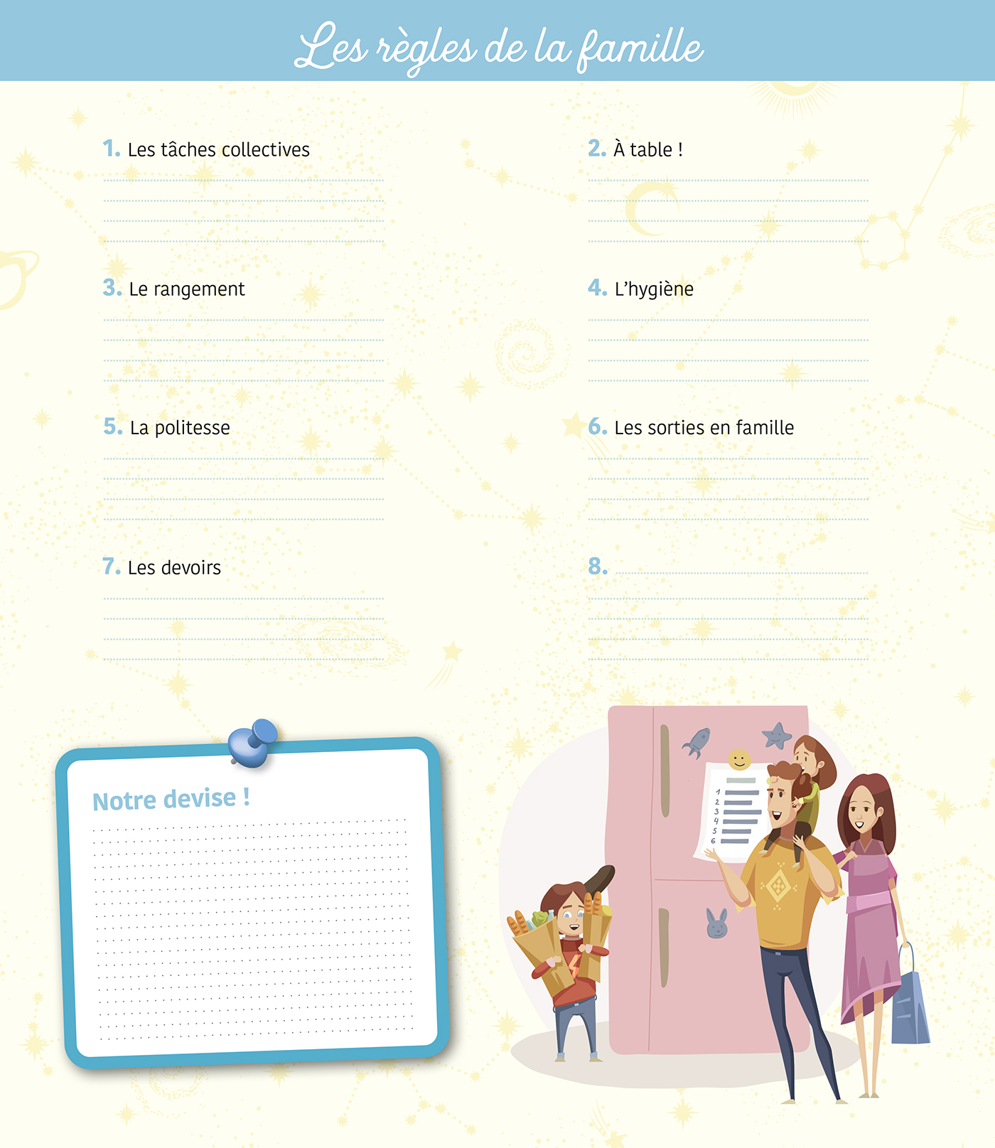 – Des fiches pratiques : l'emploi du temps, les règles de la famille, le tableau des missions, les anniversaires, les grandes fêtes religieuses.
