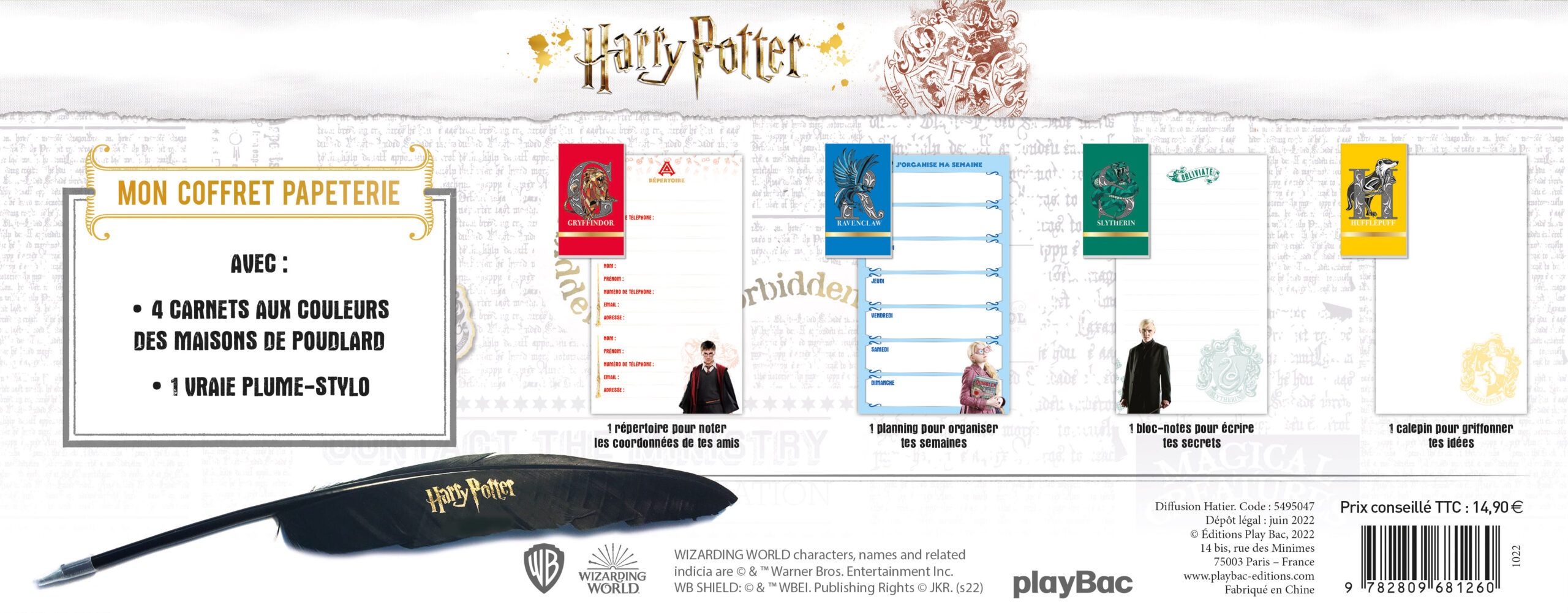 Un très joli coffret papeterie pour tous les fans d'Harry Potter ! Ce coffret contient 4 carnets aux couleurs des maisons de Poudlard (1 repertoire, 1 carnet semainier pour organiser son temps, 1 carnet de notes ligné, 1 calepin) et surtout une vraie plume-stylo de 30 cm estampillée Harry Potter (encre noire façon stylo bille).