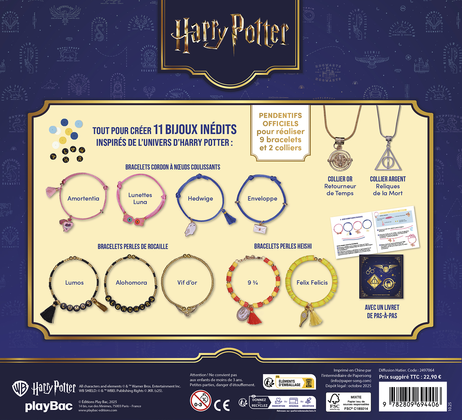 Il permet de créer jusqu’à 11 bijoux uniques : 9 bracelets et 2 colliers, à personnaliser grâce aux 9 charms métalliques officiels sous licence Harry Potter inclus dans la boîte.