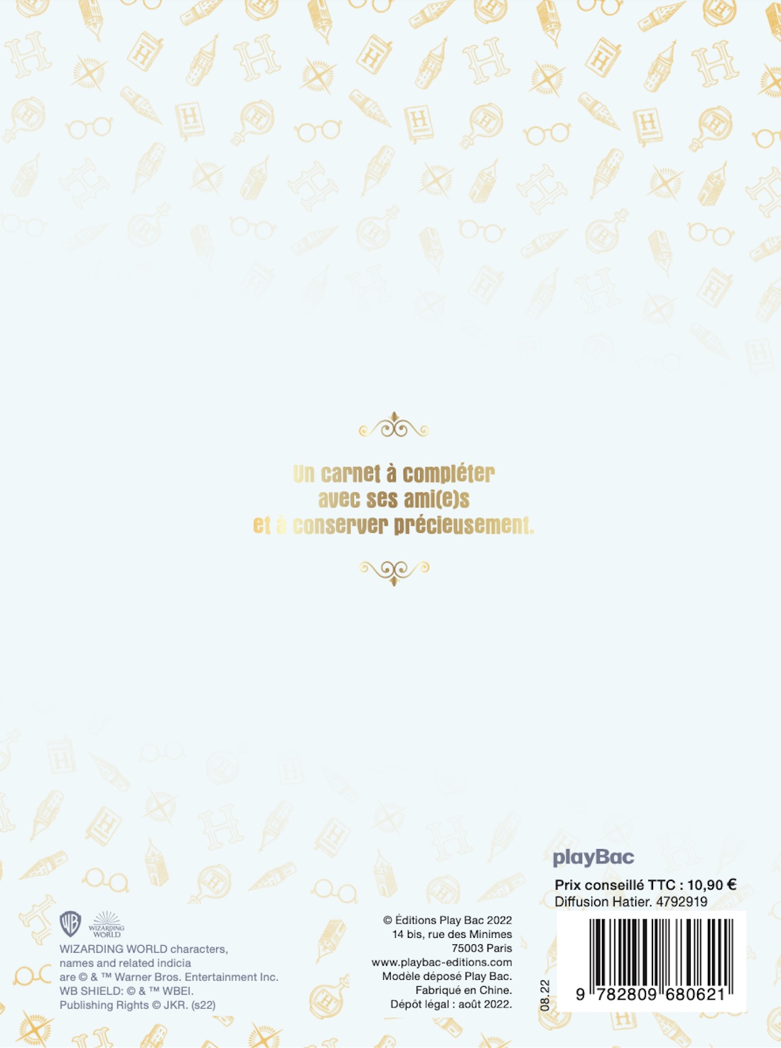 Un joli carnet d’amitié aux couleurs d’Harry Potter et de ses amis sorciers ! Dans ce carnet à transmettre à tes amis et amies, chacun pourra y inscrire son portrait, y noter ses secrets , ses anecdotes les plus amusantes, ses goûts, son personnage de Poudlard préféré… un incontournable de l’enfance pour renforcer les liens entre copains / copines et conserver de magnifiques souvenirs d’eux ! De jolies doubles pages illustrées qui permettront de retrouver l’univers de Poudlard pour tous les fans de cette saga mythique.