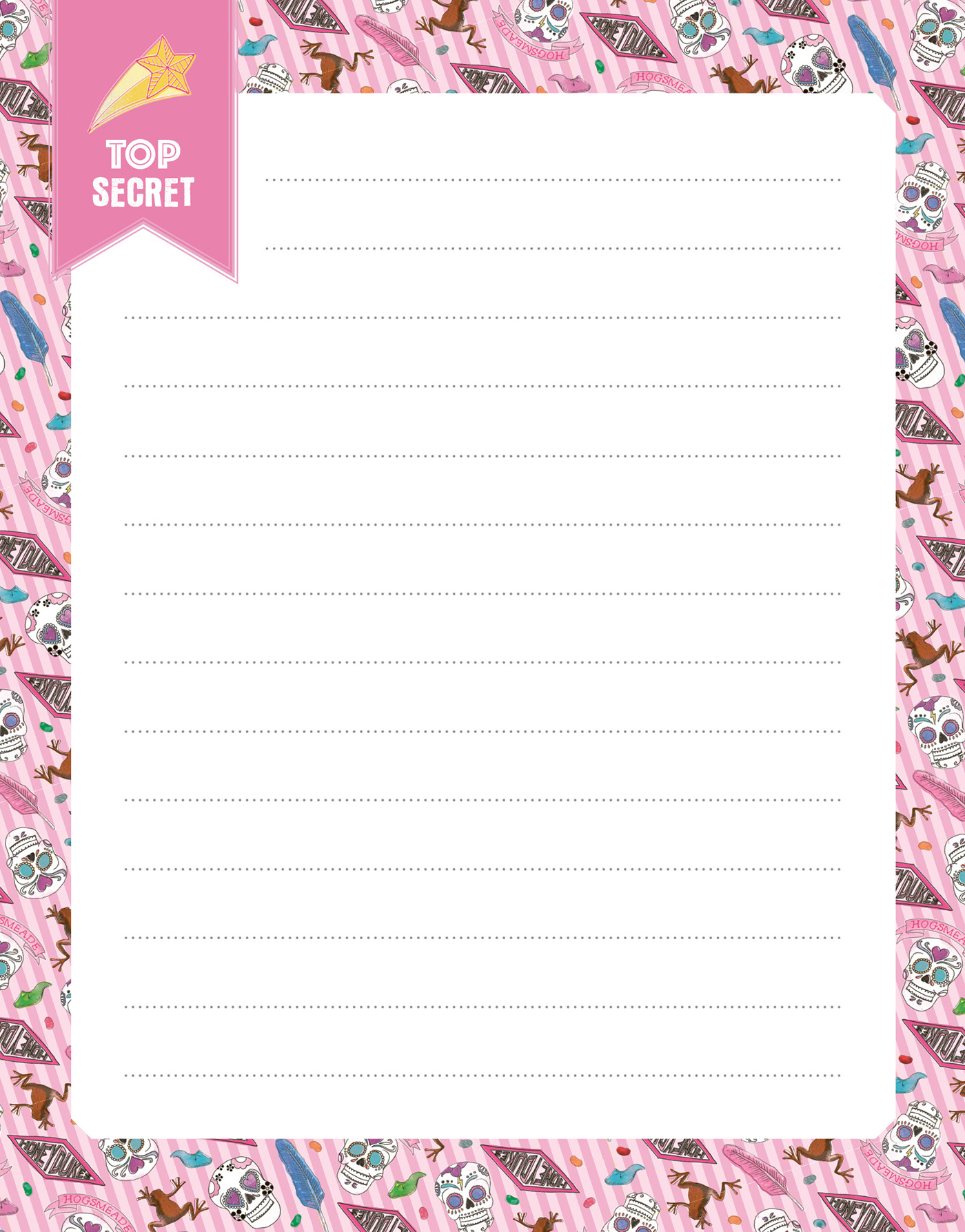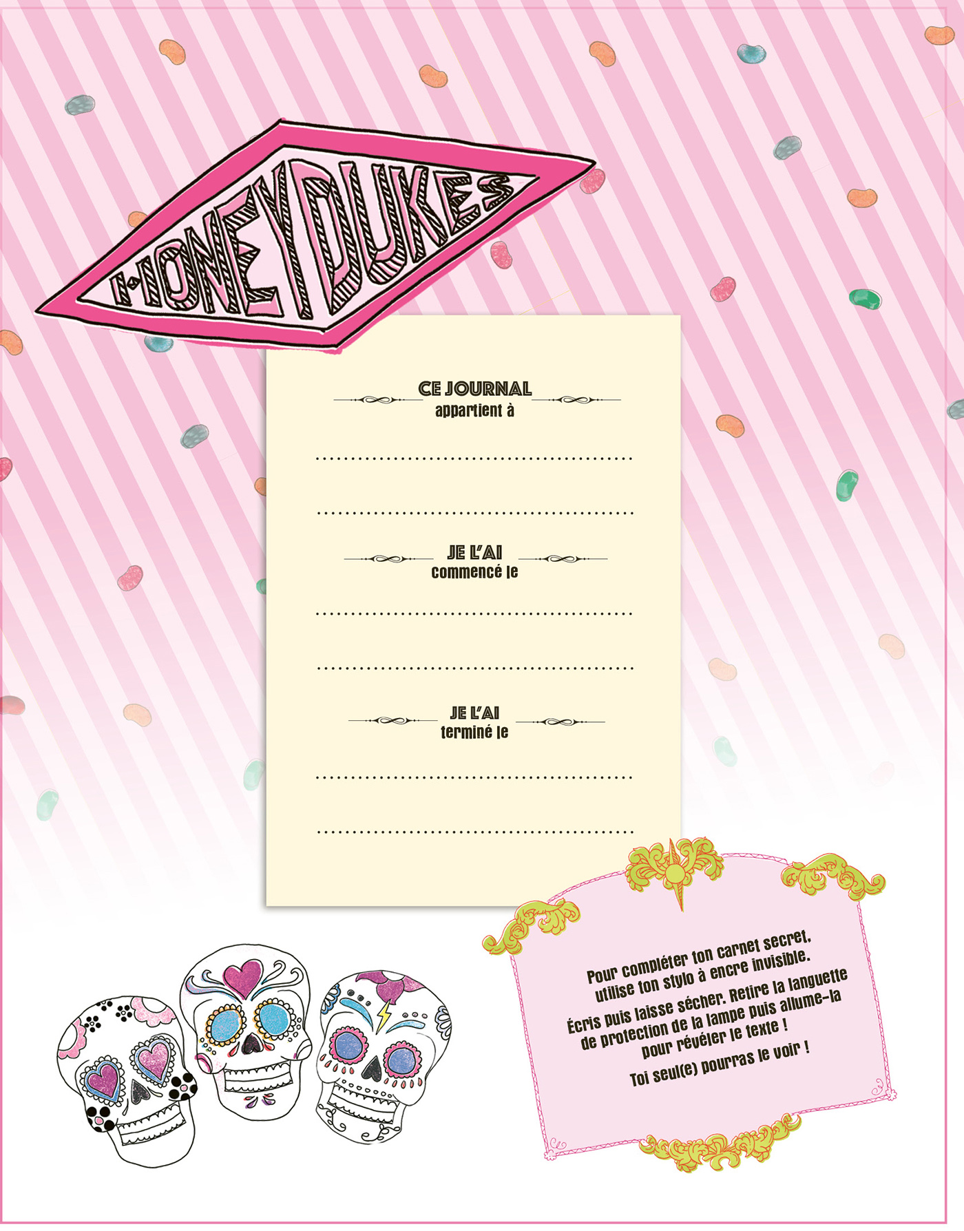 Le coffret contient un journal secret avec du doré sur la couverture, un cadenas et des clés dorés pour mettre ses secrets à l'abri ; un stylo magique à encre invisible (elle se révèle uniquement si elle est éclairée par la lampe incrustée dans le capuchon du stylo) ; un superbe porte-clés doré ; une adorable gomme et deux rouleaux de masking-tape avec de jolis motifs Harry Potter pour décorer les pages du journal ; un bloc-notes pour noter des petits mots.