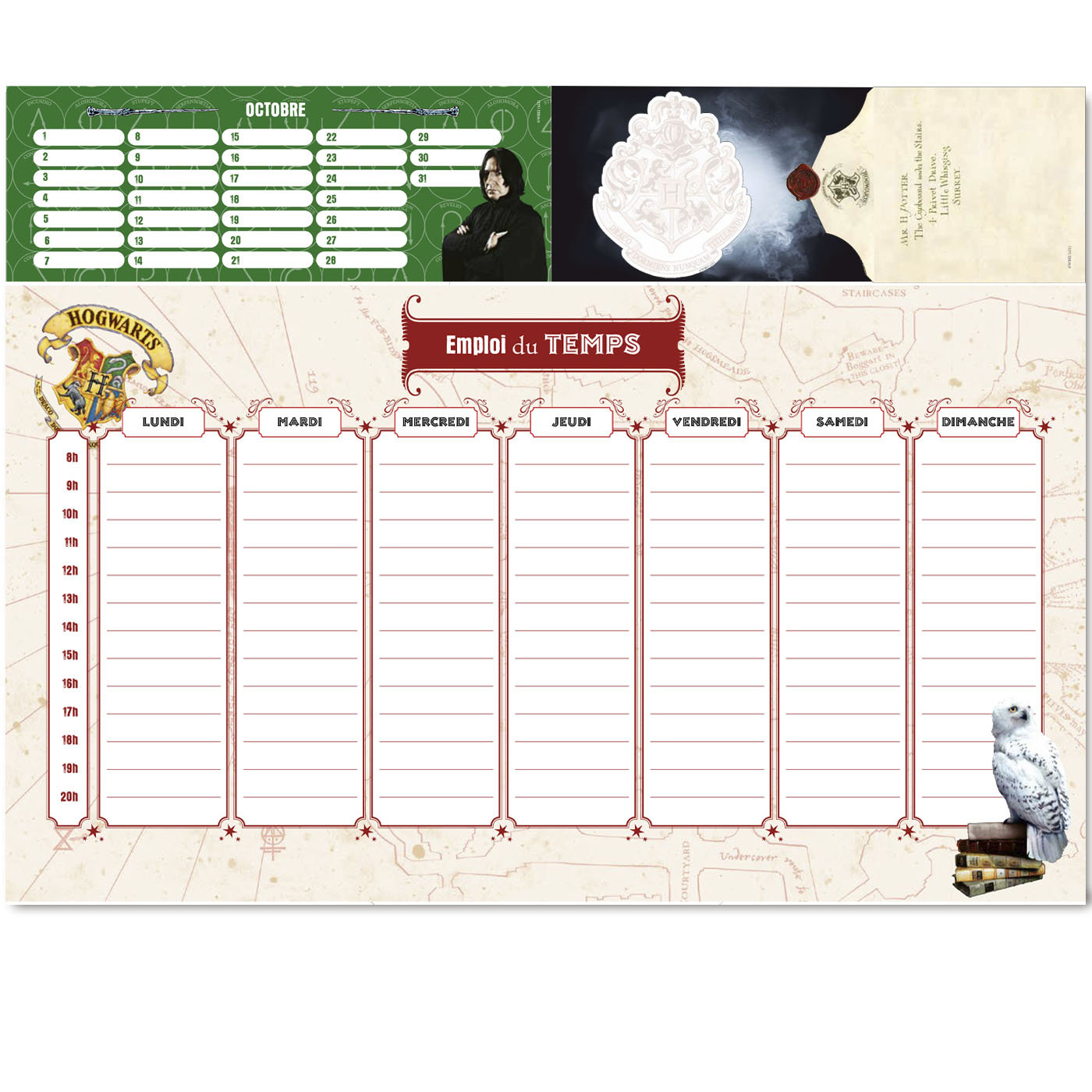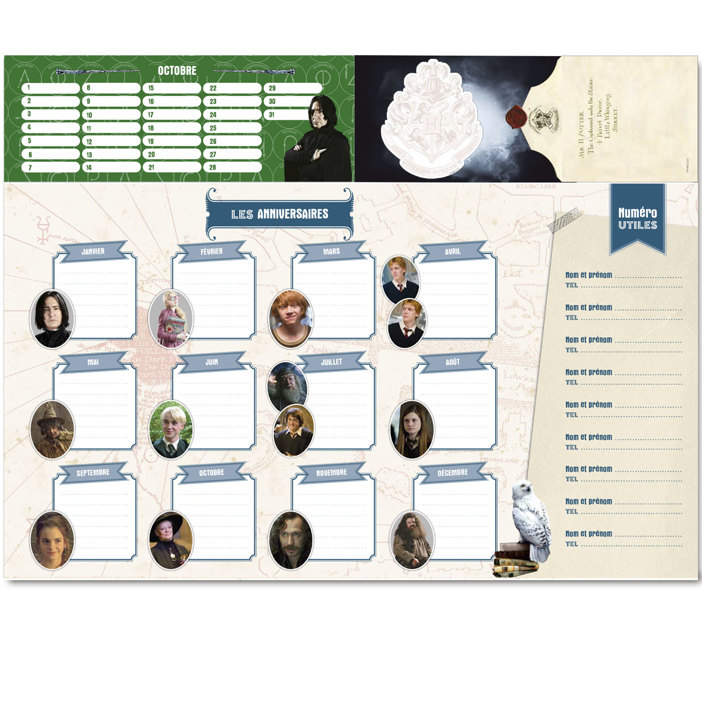 Un joli sous-main à poser sur son bureau pour vivre une année bien organisée en compagnie d’Harry Potter, le plus célèbre des sorciers ! Un très beau set papeterie à offrir à tous les fans de Poudlard et de ses héros. Cet organiseur contient : 1 bloc de 52 pages façon semainier pour s’organiser, noter ce qui est important ou laisser libre cours à son imagination, 1 bloc calendrier 12 mois pour se repérer dans le temps et repérer les fêtes de tes amis, 1 bloc de post-it pour griffonner, dessiner, noter tes pensées et tes idées, 1 bloc de 55 mini enveloppes à remplir, à plier et à envoyer. En bonus : une page anniversaire pour ne pas oublier ceux que tu aimes et un joli emploi du temps.