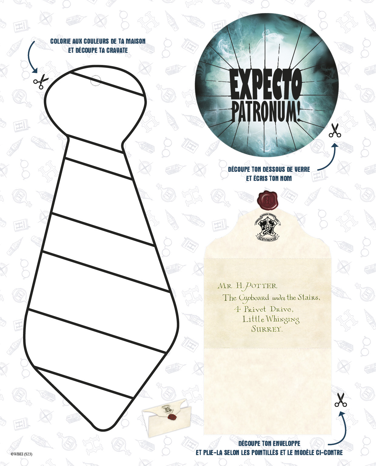 Tout le matériel pour animer une fête avec 12 enfants : 12 grands blasons à colorier ; 12 badges-cravates en papier à personnaliser ; 12 paires de lunettes en carton Luna Lovegood et Harry Potter pour se prendre en photo (et garder un souvenir de ce moment !) ; 12 enveloppes à message ; 12 dessous de verre ; 2 planches de marque-verres autocollants ; 1 grande guirlande à fabriquer.