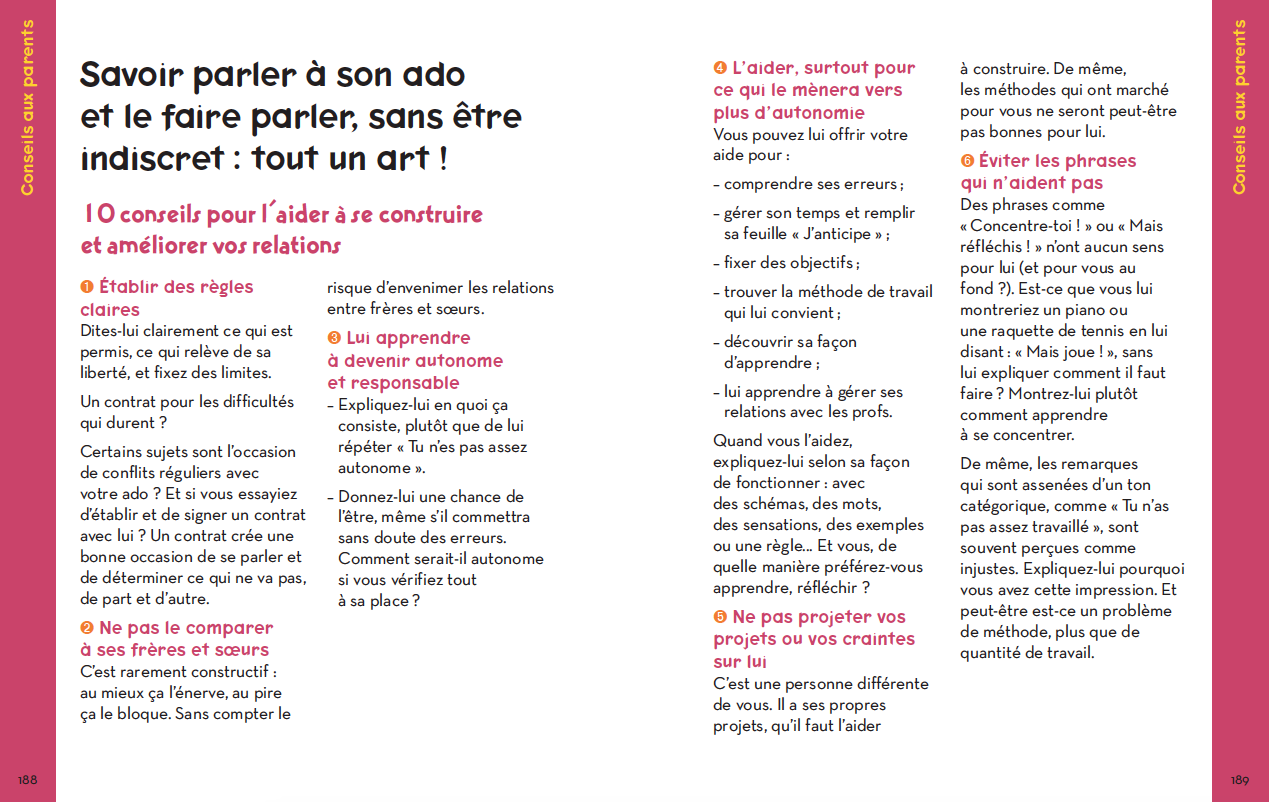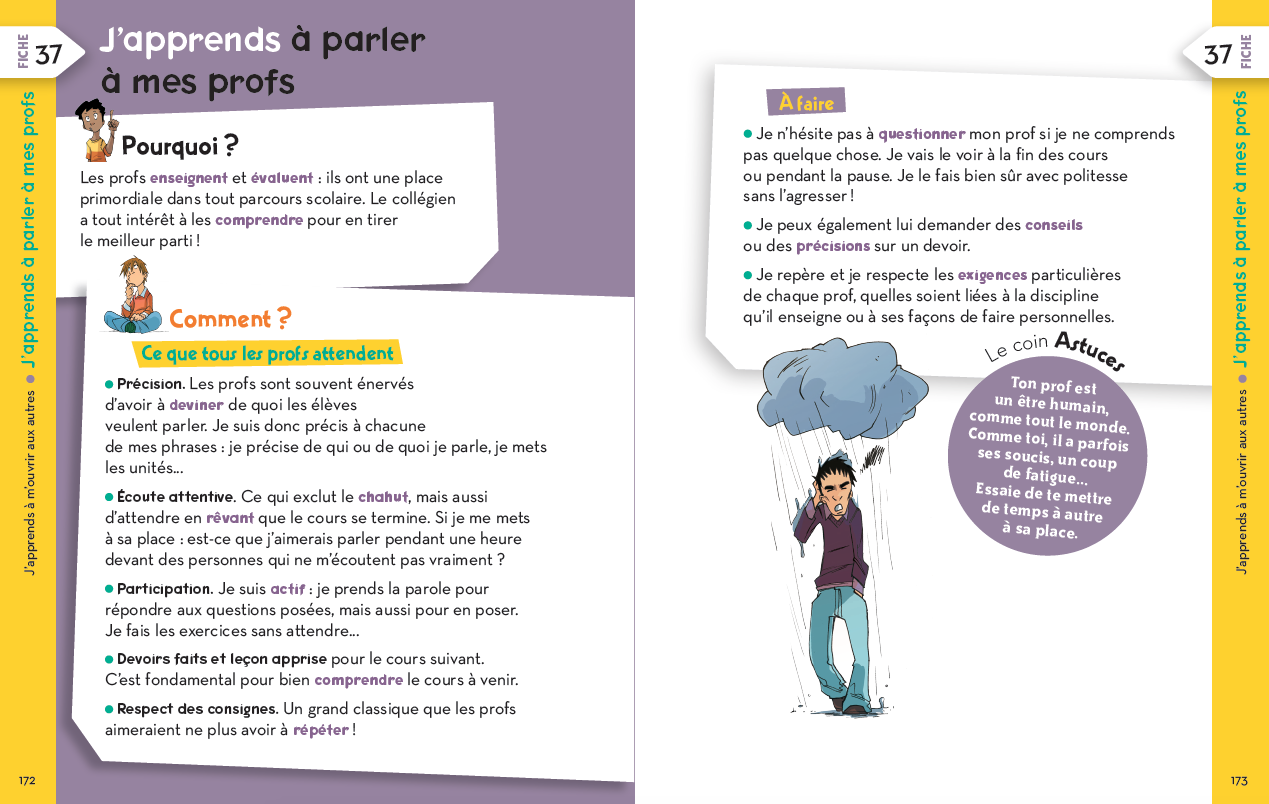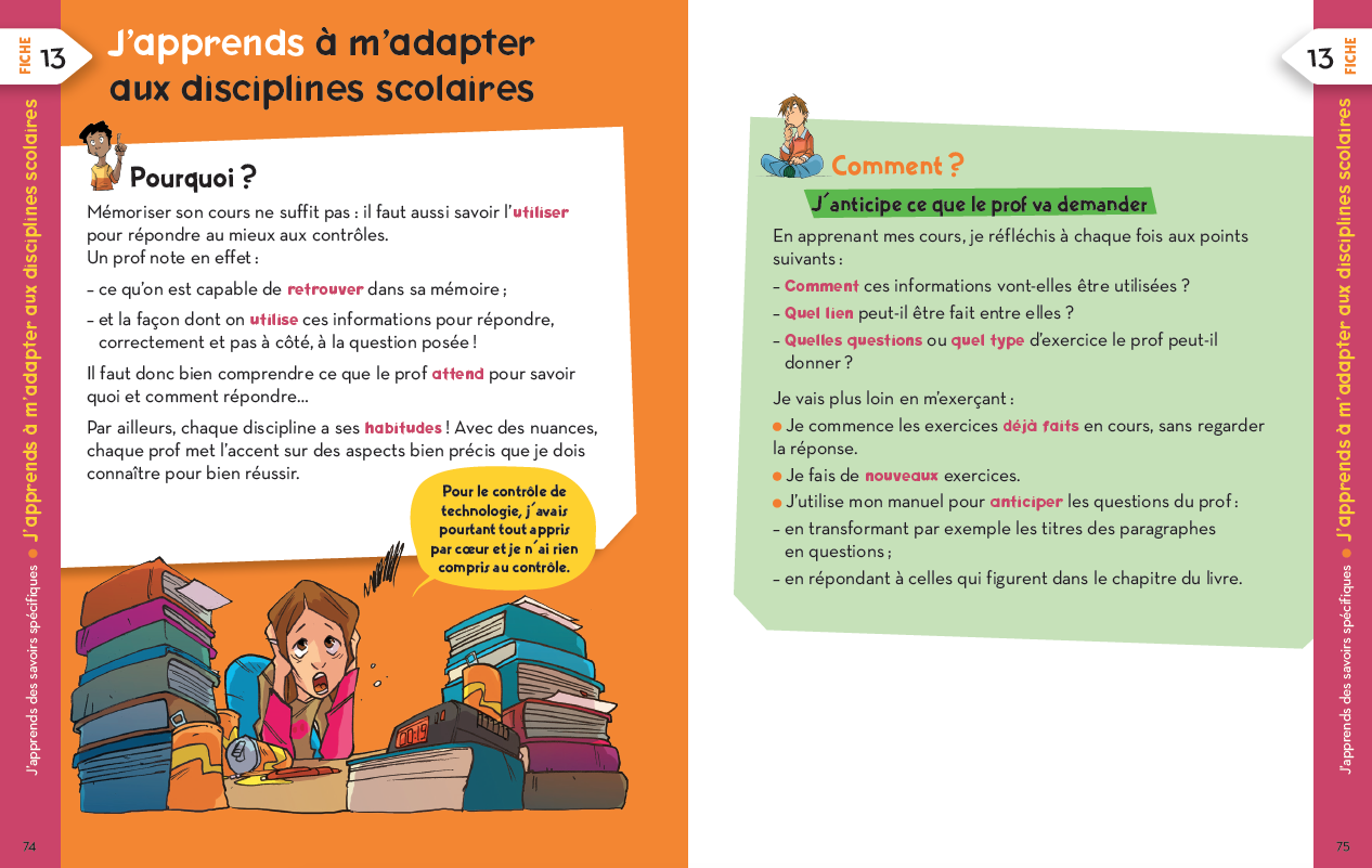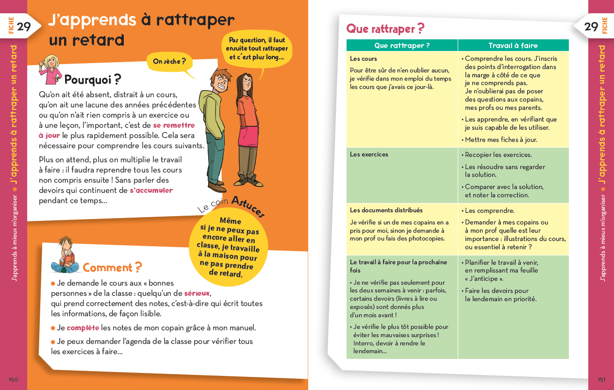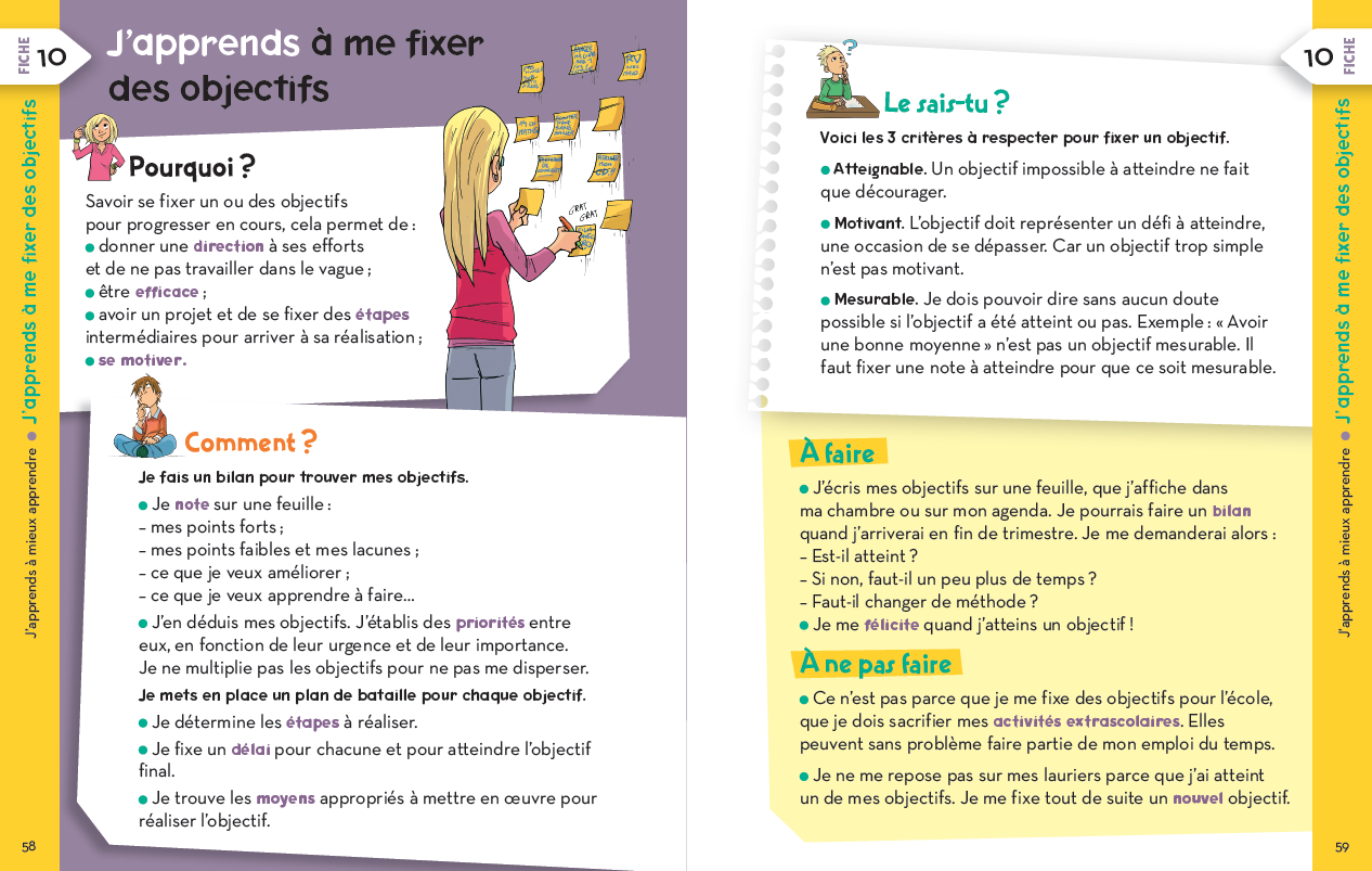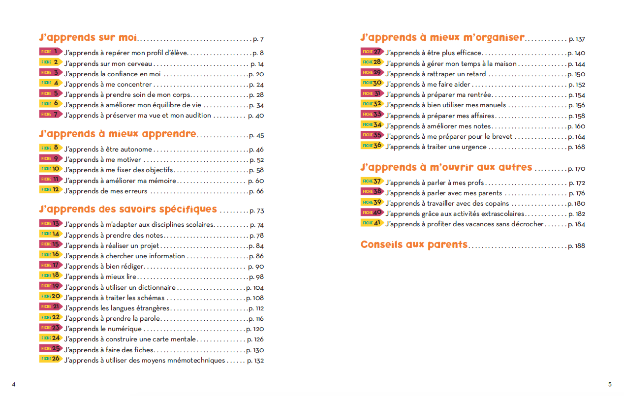 Comment améliorer sa mémoire et sa concentration ? Comment mieux réussir ses contrôles ? Comment faire ses devoirs efficacement et sans stress ? Comment travailler en groupe projet ? Et comment se motiver, parfois, pour aller au collège ? Autant de questions que les enfants et leurs parents se posent souvent et auxquelles cet ouvrage répond. Dès la 6e et jusqu’à la 3e, grâce à ces 40 fiches pratiques, votre enfant pourra apprendre à : – repérer et exploiter ses points forts ; – identifier ses faiblesses et ses erreurs pour les rectifier ; – s’enrichir de ses relations avec les autres ; – être bien dans sa peau et dans sa tête !