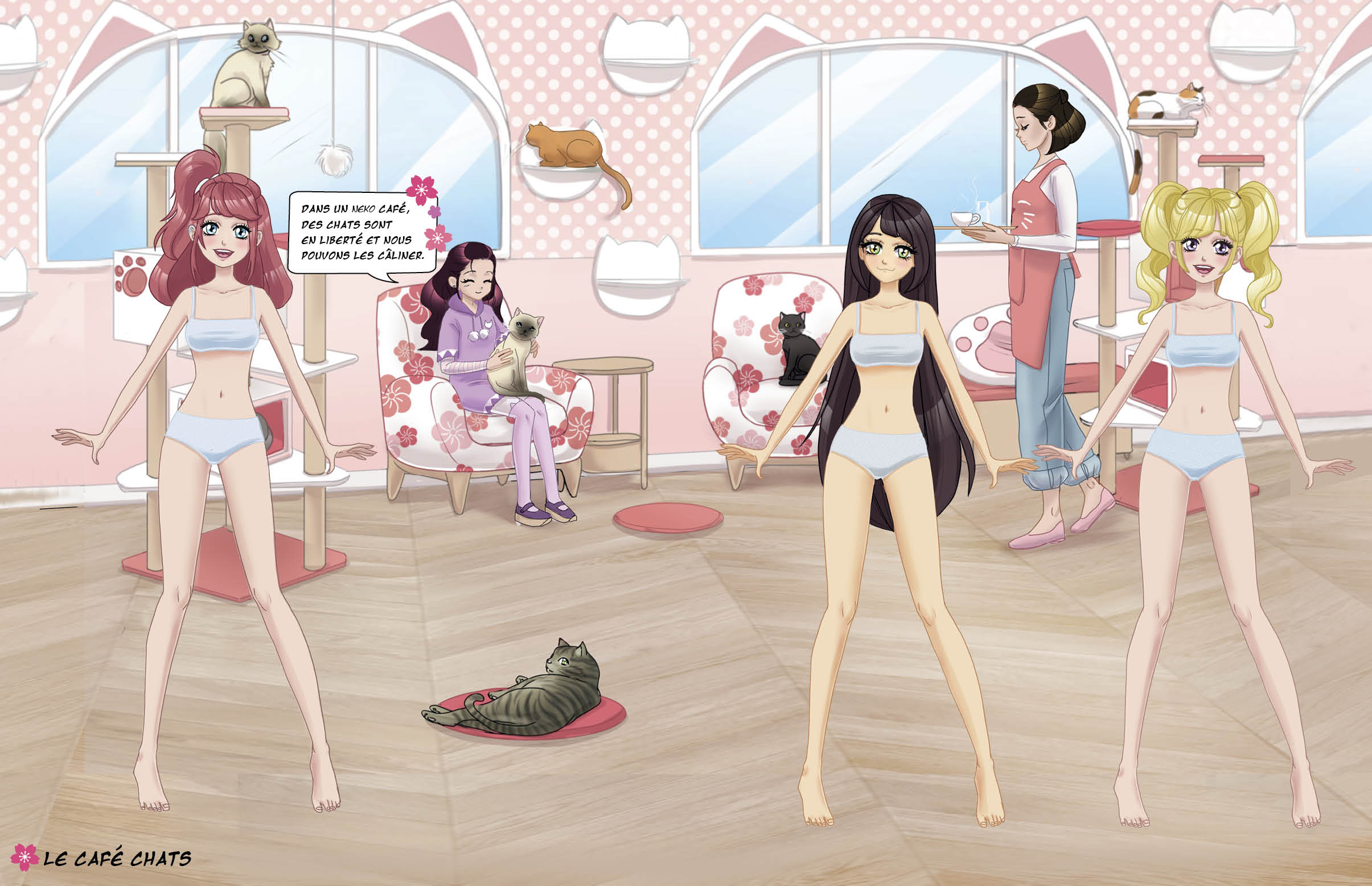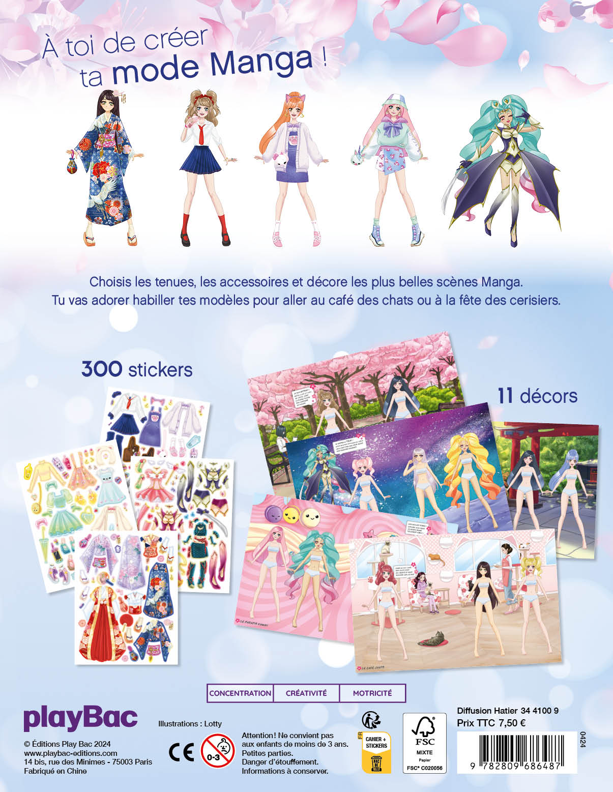 Un cahier de 300 autocollants 100% Manga pour choisir des tenues, des accessoires et habiller les modèles dans les plus beaux décors japonais : à la fête des cerisiers, dans les rues de Tokyo ou dans un café à chats !