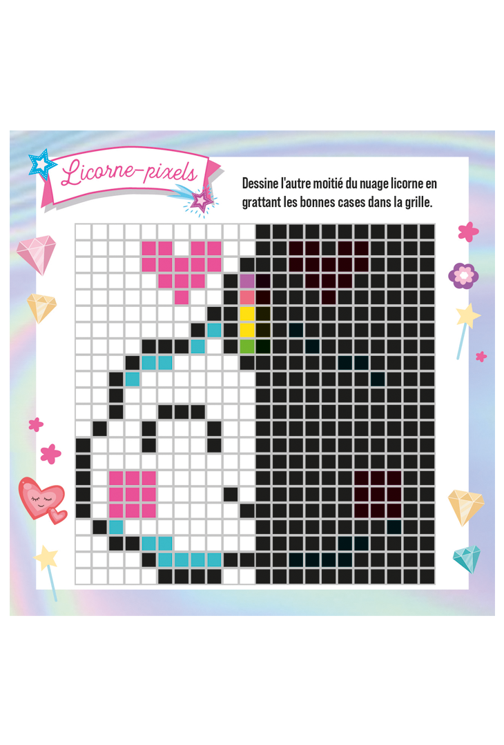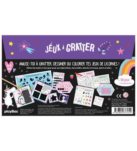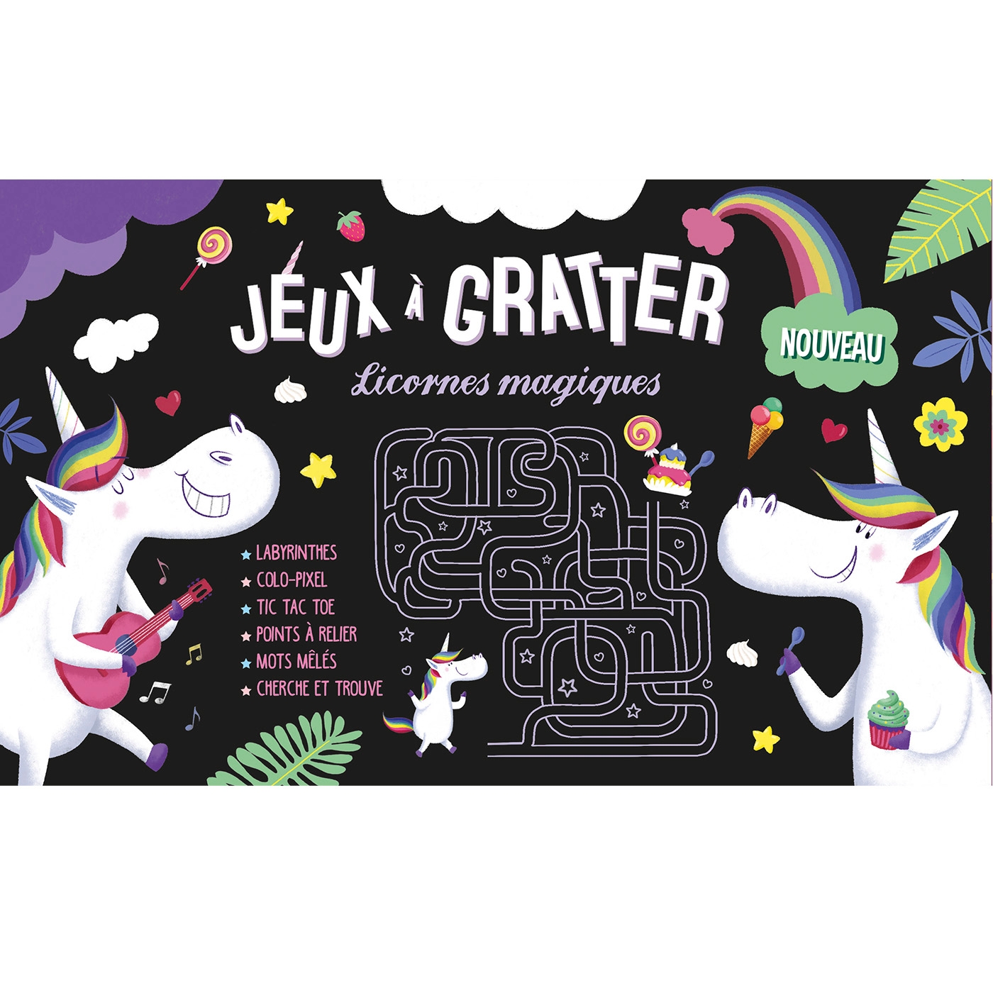 La seule pochette de jeux à gratter réservée aux enfants ! Amuse-toi à gratter, dessiner ou colorier tes jeux de licornes ! Utilise ton stylet en bois pour jouer. Cette pochette contient 50 jeux : labyrinthes, color pixels, points à relier, mots mêlés, cherche et trouve, jeu des différences… Avec son format pratique et ludique, amuse-toi partout, seul ou avec tes copains !