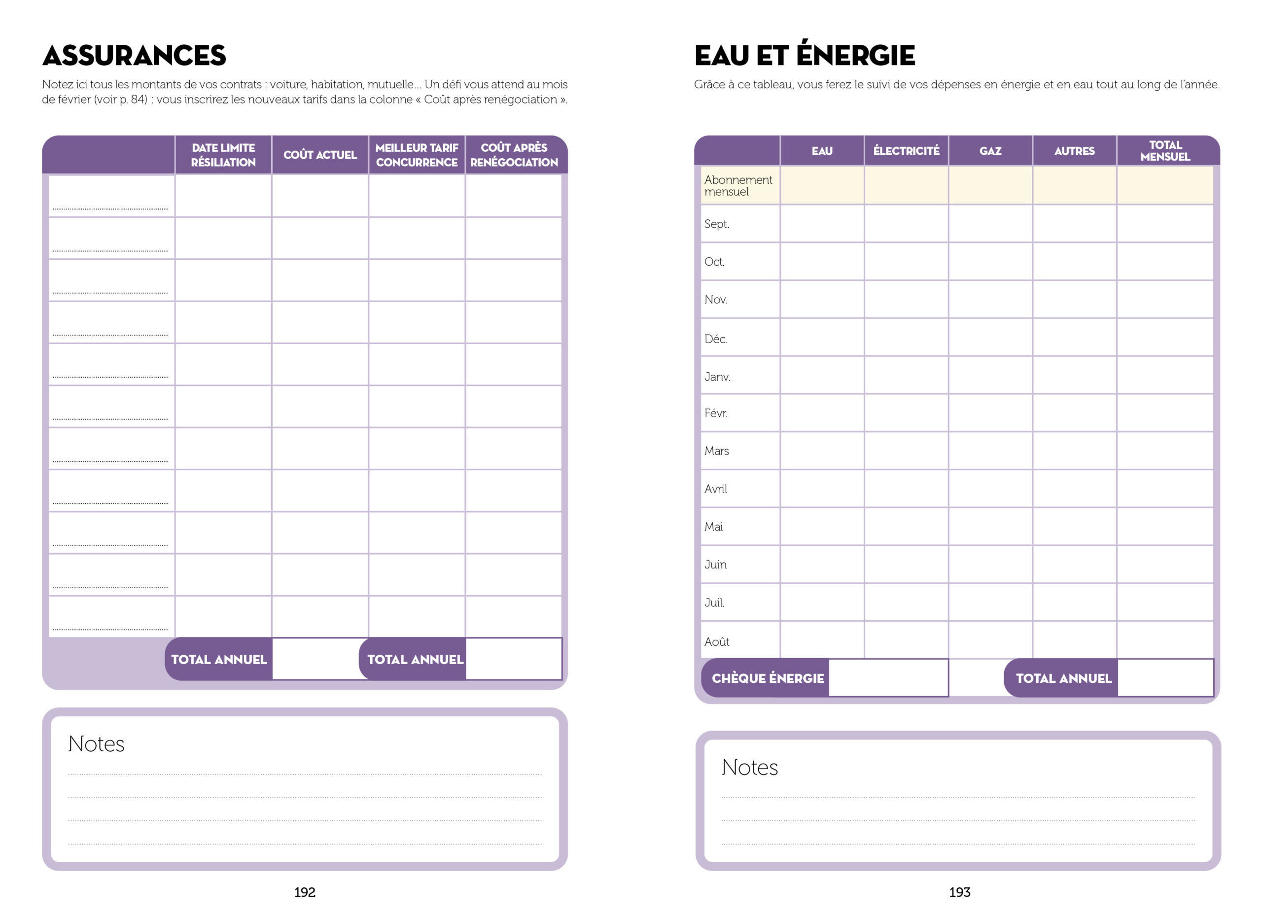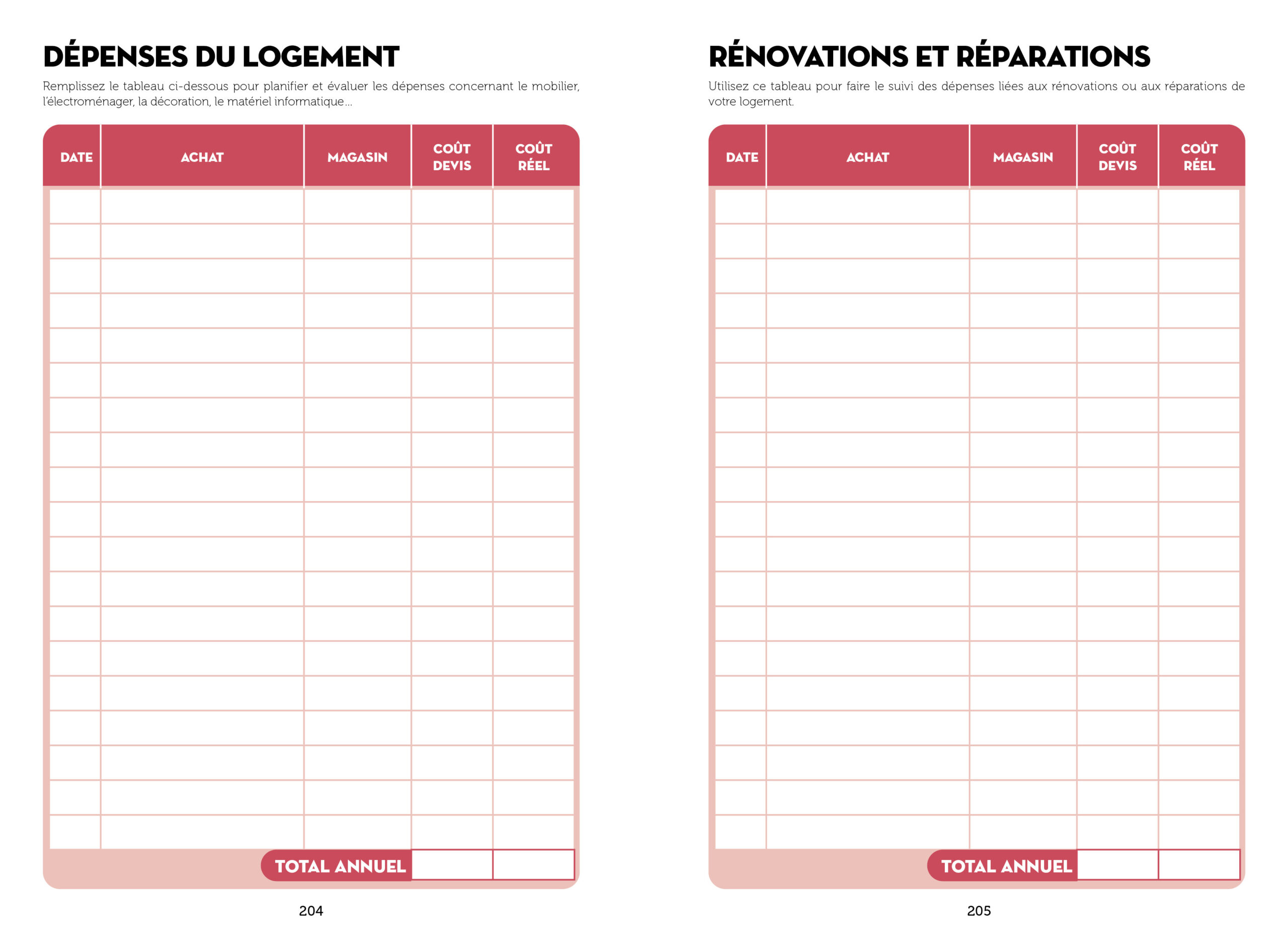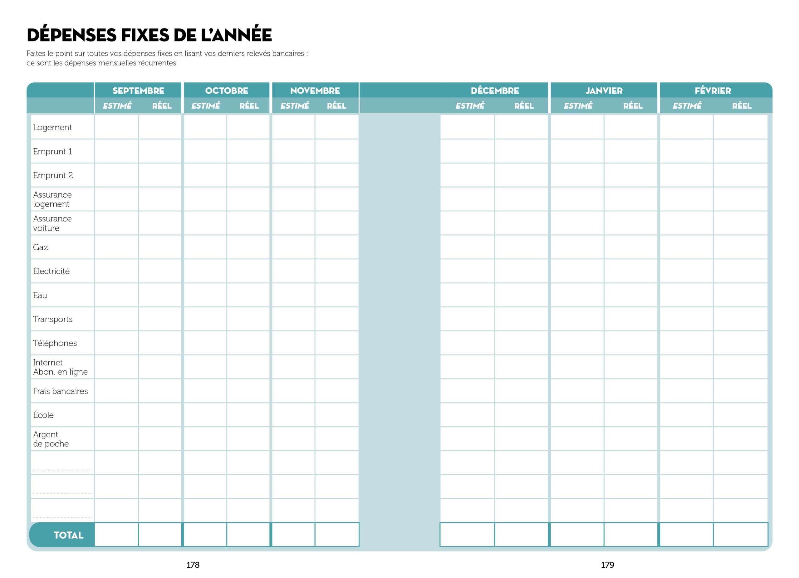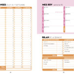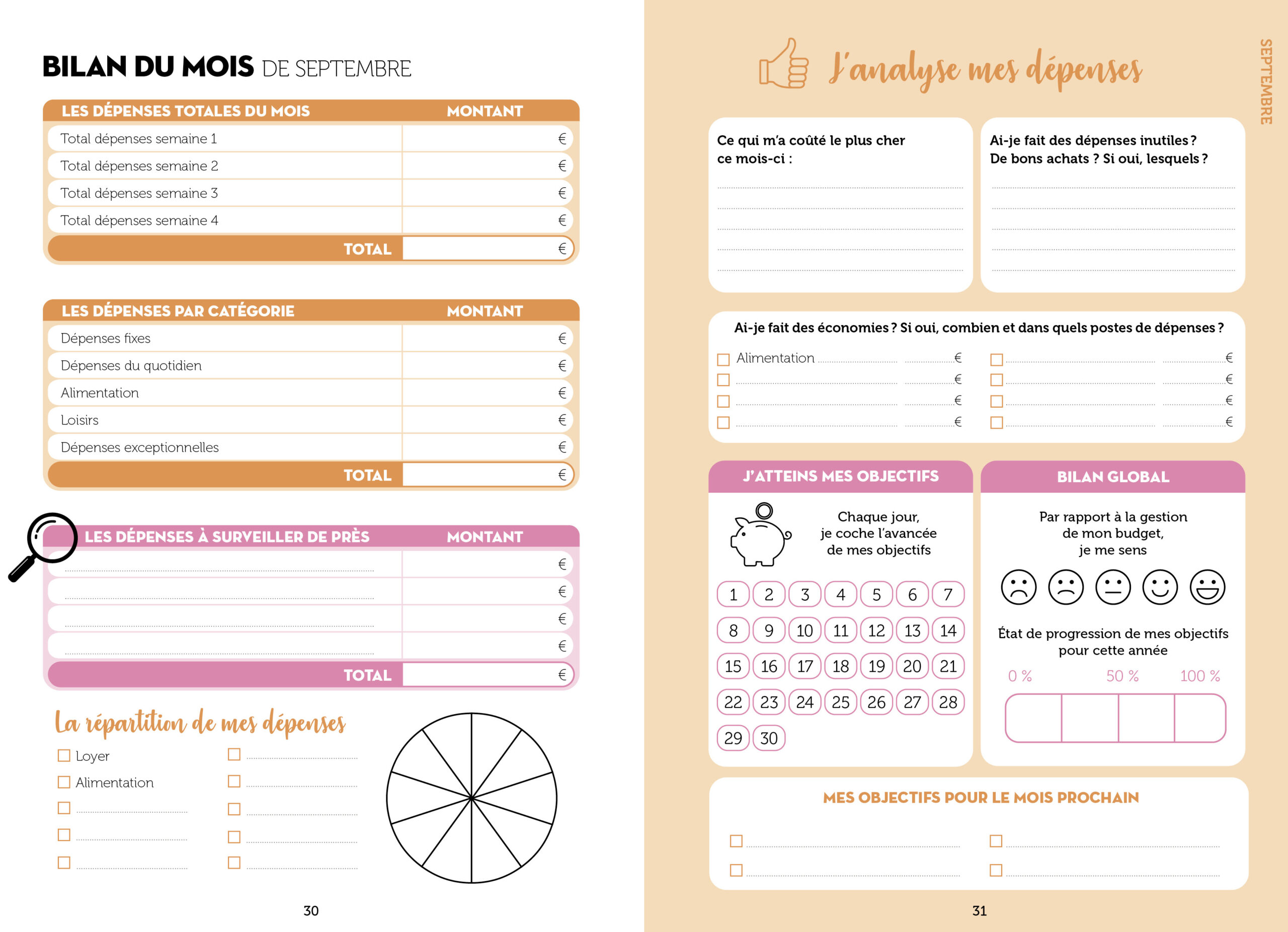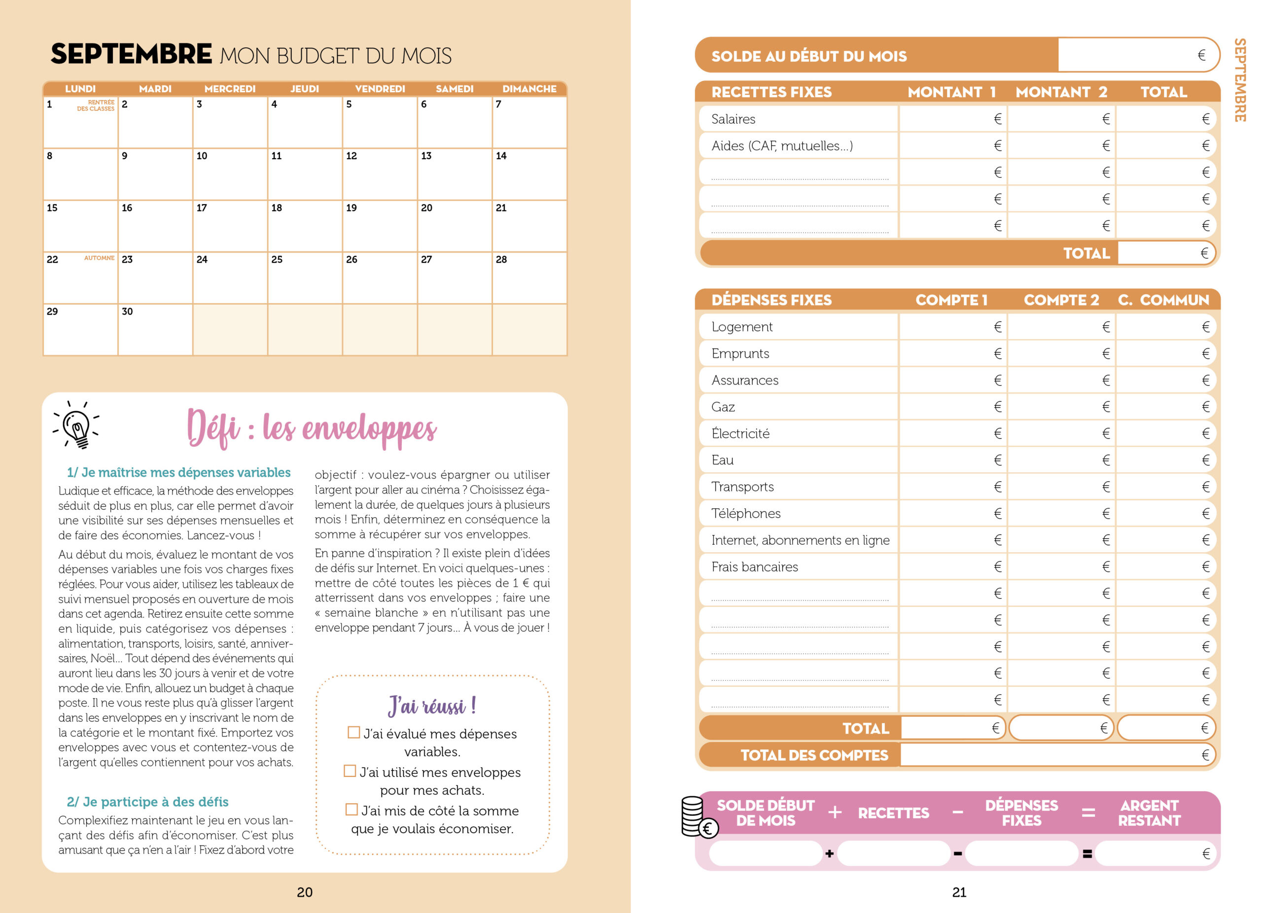 Chaque mois : le tableau de suivi des dépenses (dépenses et recettes fixes + spécifiques), des astuces et conseils pour économiser et un agenda mensuel pour noter ses principaux rendez-vous.