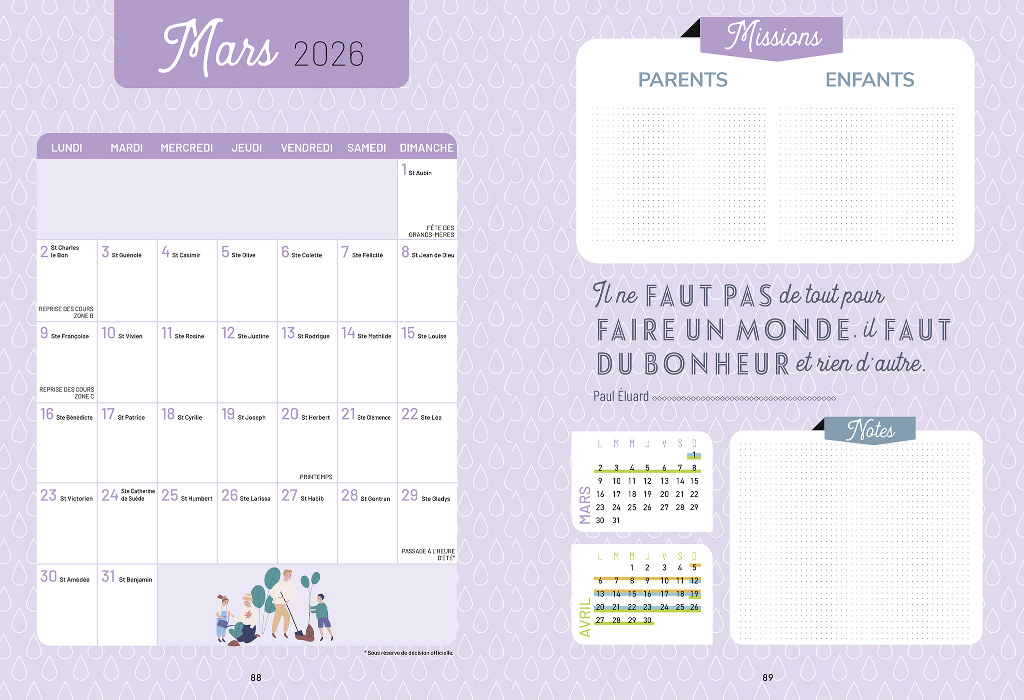 Retrouvez tous les mois : un planning mensuel avec un espace dédié aux parents et un autre aux enfants et un emplacement pour noter les priorités du mois.