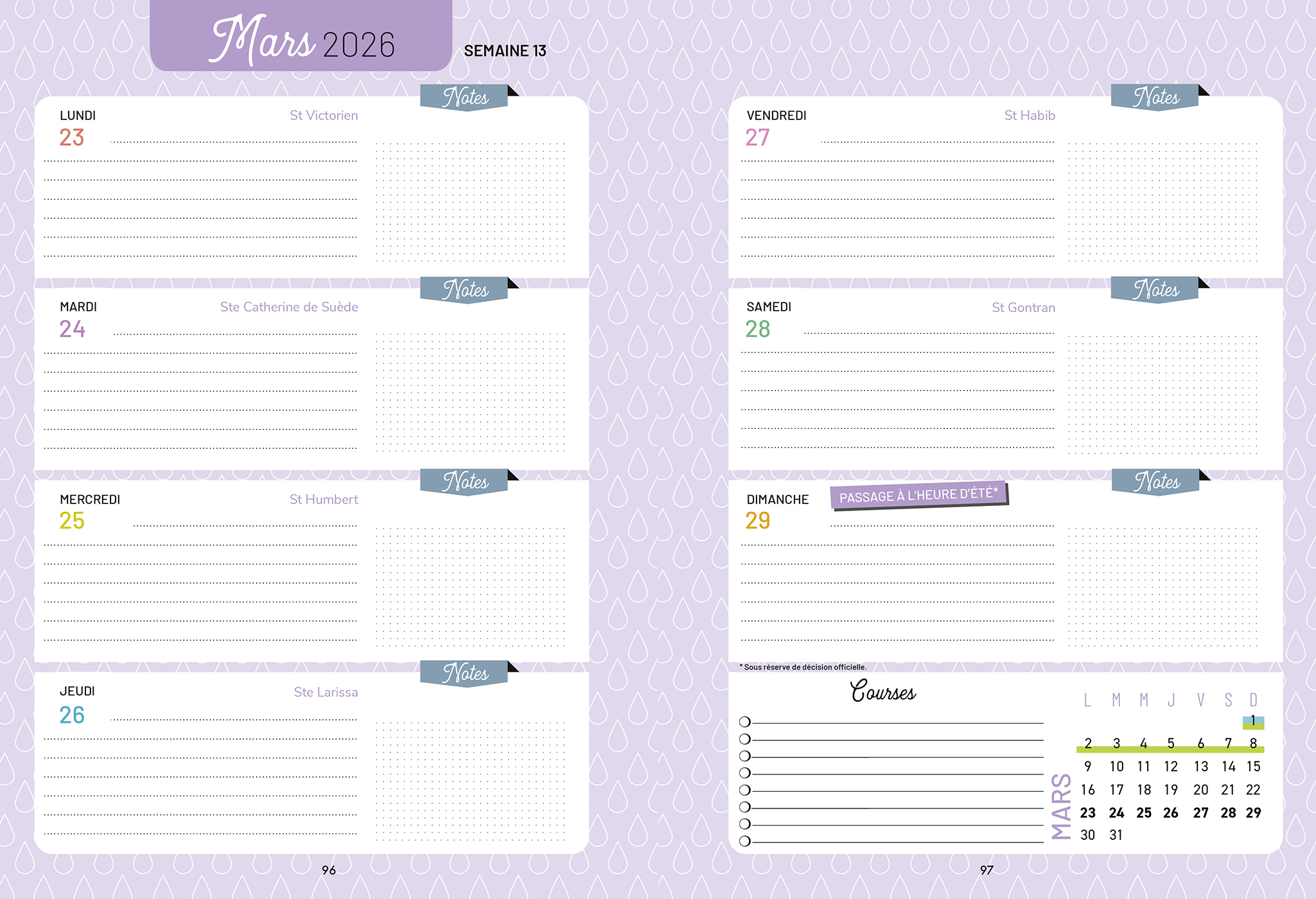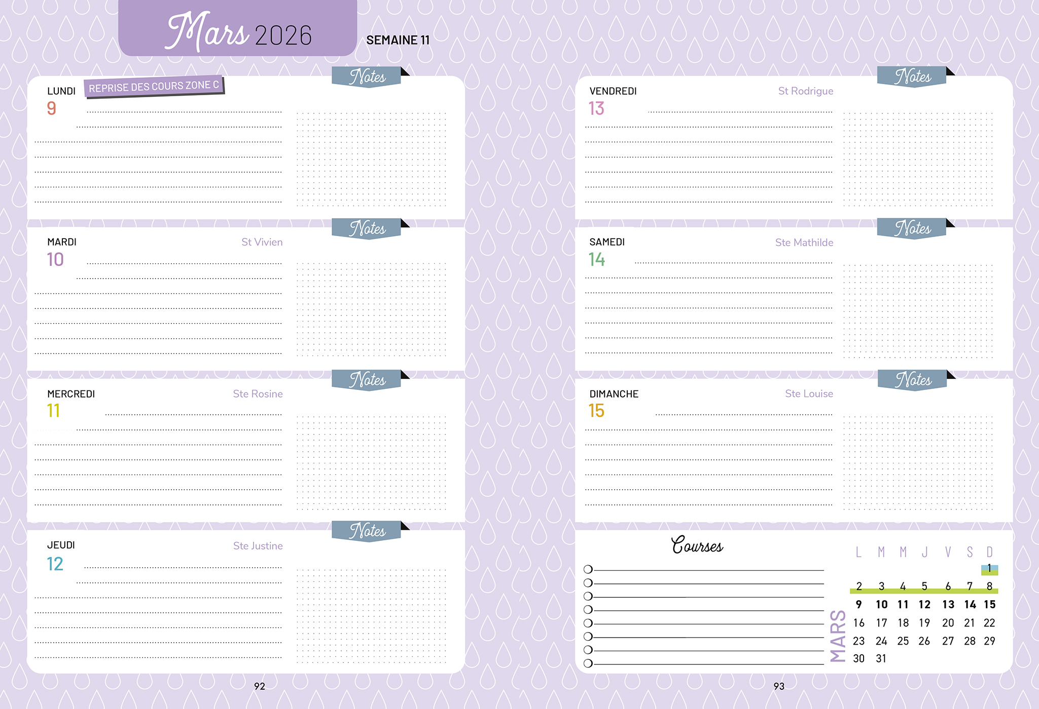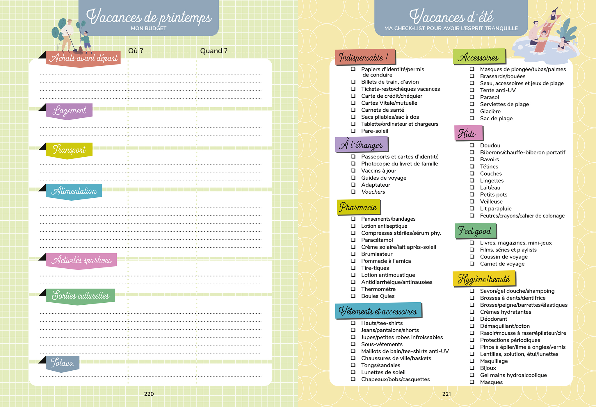 – Des pages ultra pratiques (contacts, emplois du temps, check-lists et budgets de vacances, etc.).