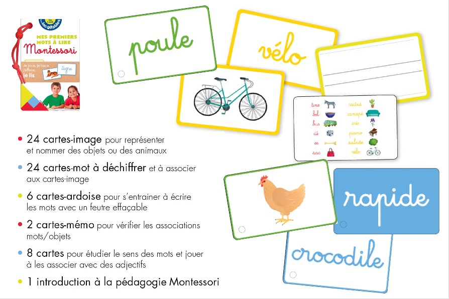 Ce titre contient : > 24 cartes images pour représenter et nommer des objets ou des animaux ; > 24 cartes mots à déchiffrer et à associer aux cartes images ; > 6 cartes ardoise pour s’entraîner à écrire les mots avec un feutre effaçable ; > 2 cartes mémos pour vérifier les associations mots/objets ; > 8 cartes pour étudier le sens des mots et jouer à les associer avec des adjectifs ; > 1 introduction à la pédagogie Montessori. Ce titre permet à l’enfant : > d’appréhender les mots : de les associer à des images ; > d’appréhender les sons : avec des illustrations d’animaux et d’objets ; > de se familiariser au traçage des mots.