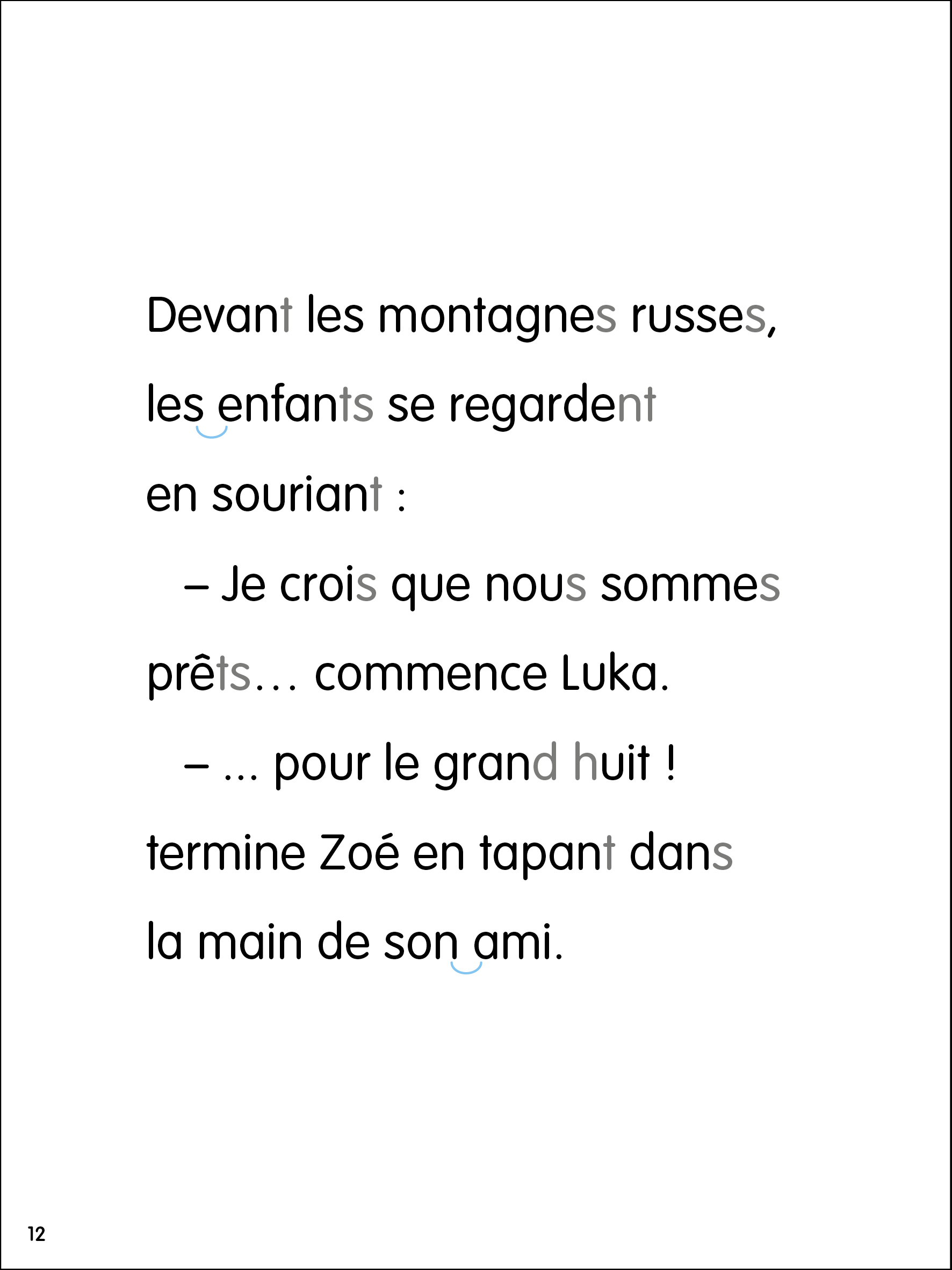 Luka et Zoé passent la journée au parc d’attractions. Ils montent dans le bateau pirate, tournent dans les soucoupes volantes, et s’amusent comme des fous ! Mais un dernier défi les attend : le grand huit. Vont-ils oser monter dans ces montagnes russes ?