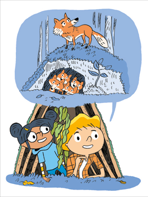 Dans la forêt, Zoé et Luka découvrent la tanière d’une renarde. C’est l’occasion rêvée pour construire une cabane avec papi et mamie, et l’observer discrètement !