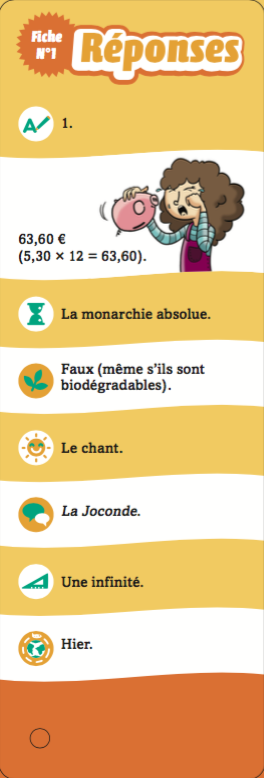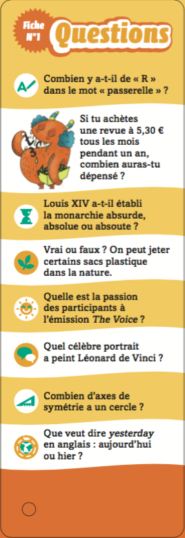Depuis 1989, Les incollables accompagnent les enfants sur la route de l’apprentissage et du jeu. Les questions-réponses offrent un moment de jeu, de convivialité et de connaissance aussi. Eh oui, car selon nous, on n’apprend jamais mieux que quand on y prend du plaisir ! Dans ce titre : tout le programme de CM1 est synthétisé en 900 questions-réponses. En bonus : des pages rupture avec des quiz 100 % divertissement et des quiz pour coller ses parents ou découvrir qu’ils sont eux aussi incollables. 2 éventails à emporter partout pour apprendre en s’amusant. Toutes les matières sont traitées et les questions sont conformes au nouveau programme. Le tout dans une boîte pratique et super solide. Les incollables, un concept unique et innovant déjà adopté par plus de 50 millions d’enfants.