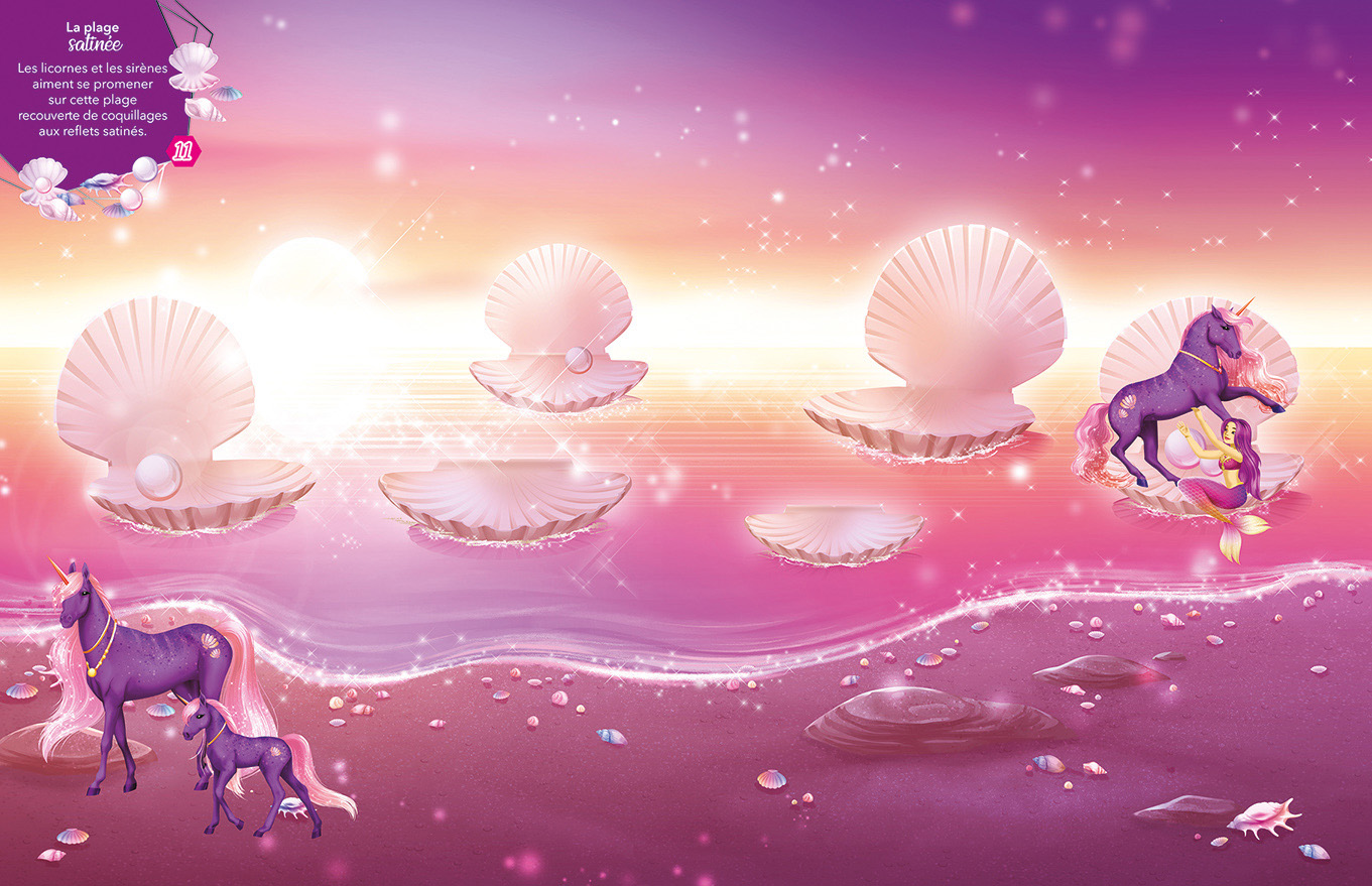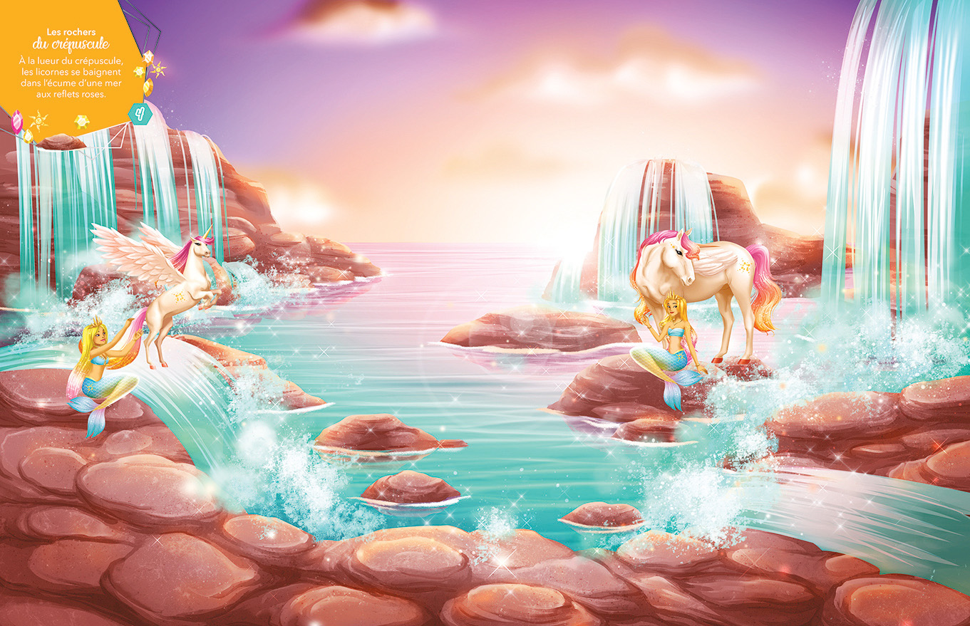 Les licornes et les sirènes vivent en harmonie dans un monde aquatique merveilleux. Grâce à leurs pouvoirs, elles font jaillir des jets d'eau magiques ou créent des cascades scintillantes. Les licornes les plus puissantes sont dotées d'une queue de poisson qui leur permet de nager, et peuvent même respirer sous l'eau.
