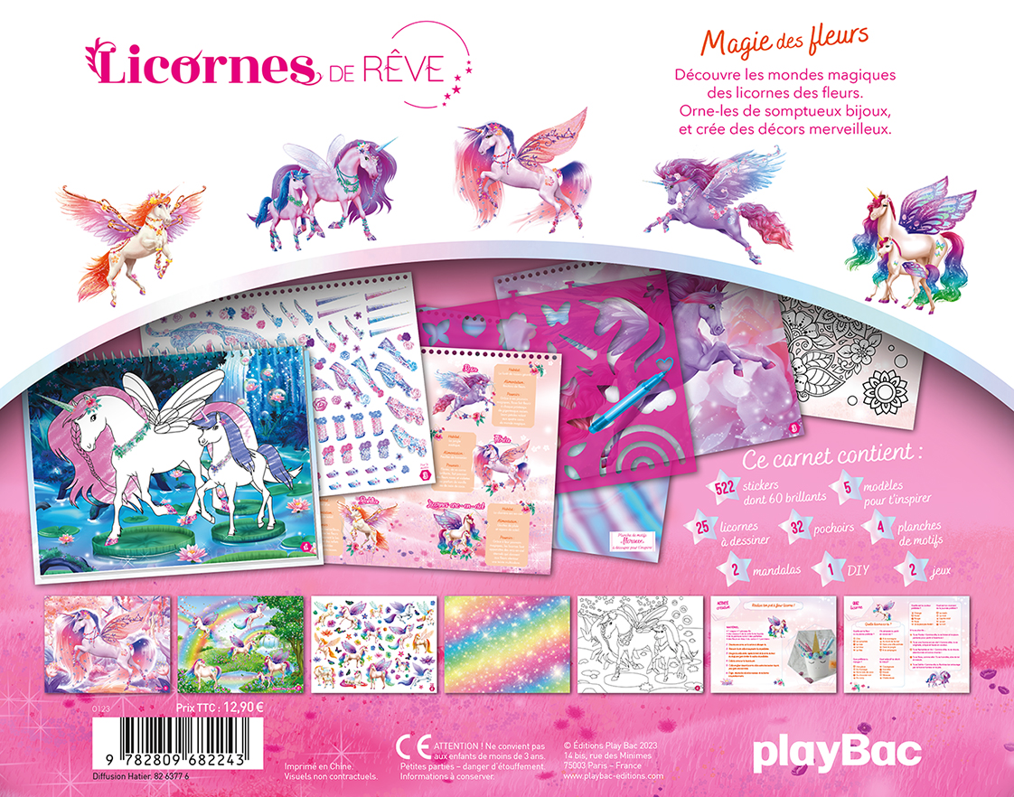 Un grand carnet créatif avec plus de 500 autocollants de Licornes, des pages de dessins, des coloriages, des pochoirs, des planches de motifs, des jeux et des modèles pour s'inspirer. L'enfant part à la découverte des mondes magiques des licornes des fleurs, les habille de somptueux bijoux, et crée des décors merveilleux.