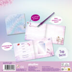- Un journal secret avec une couverture holographique scintillante, décorée d’une magnifique licorne féerique.