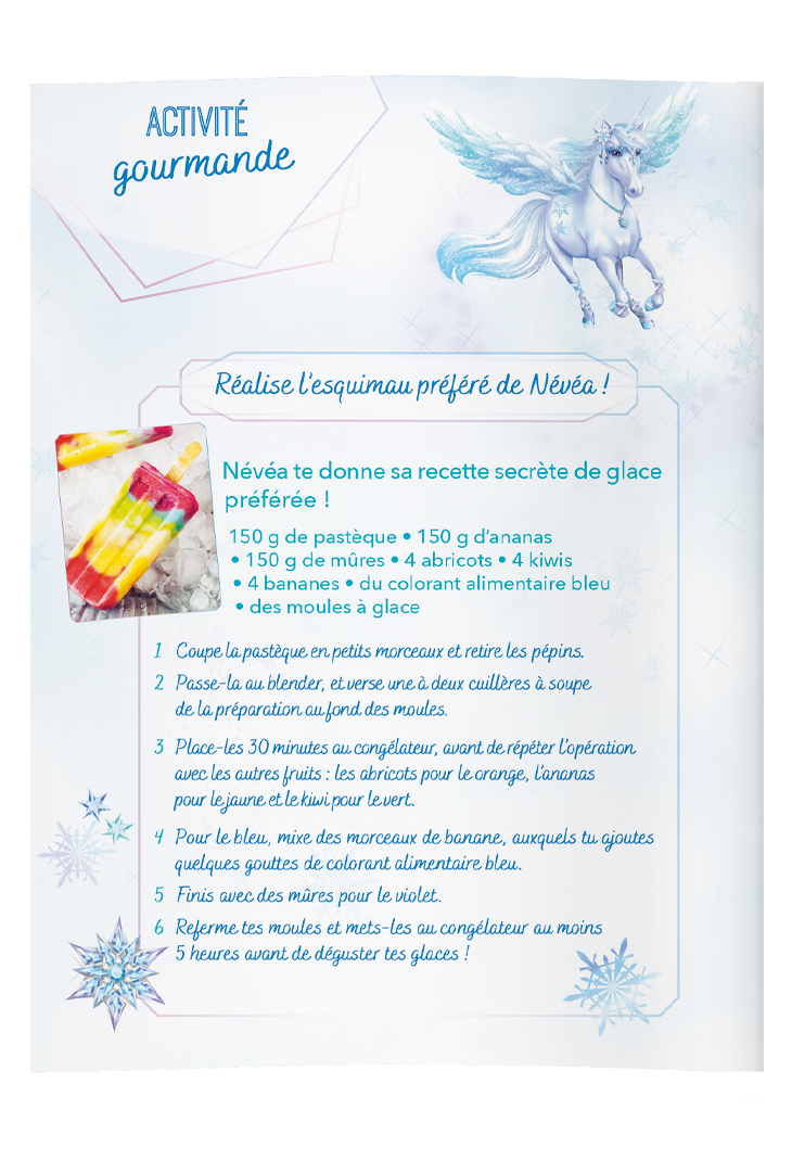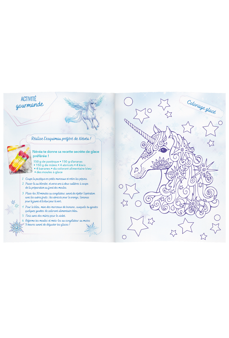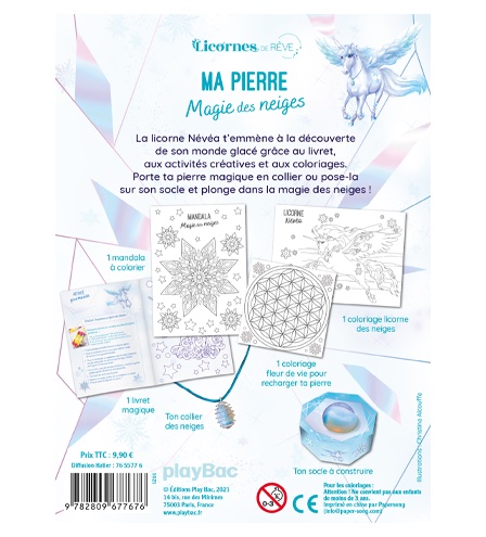 Découvre la magie des pierres avec Névéa, la licorne des neiges ! La licorne Névéa t’emmène à la découverte de son monde glacé grâce au livret, aux activités créatives et aux coloriages. Porte ta pierre magique en collier ou pose-la sur son socle et plonge dans la magie des neiges. Ce coffret contient : – 1 jolie pierre ; – 1 collier spirale pour porter ta pierre ; – 1 livret magique d’activités ; – des coloriages ; – 1 socle à construire pour exposer ta pierre.