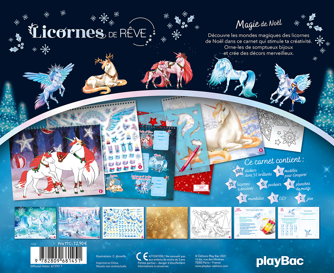 Un grand carnet créatif avec plus de 500 autocollants de Licornes, des pages de dessins, des coloriages, des pochoirs, des planches de motifs à découper, des jeux et des modèles pour s'inspirer. L'enfant part à la découverte des mondes magiques des licornes de Noël, les habille de somptueux bijoux, et crée des décors merveilleux.