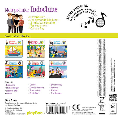 Avec ce livre sonore, l'enfant découvre les classiques de Indochine. Il s'amuse à chercher la puce dans une scène tendre et colorée, et appuie dessus pour lancer la musique tout seul.