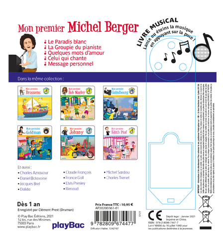 Avec ce livre sonore, l'enfant découvre les classiques de Michel Berger. Il s'amuse à chercher la puce dans une scène tendre et colorée, et appuie dessus pour lancer la musique tout seul.