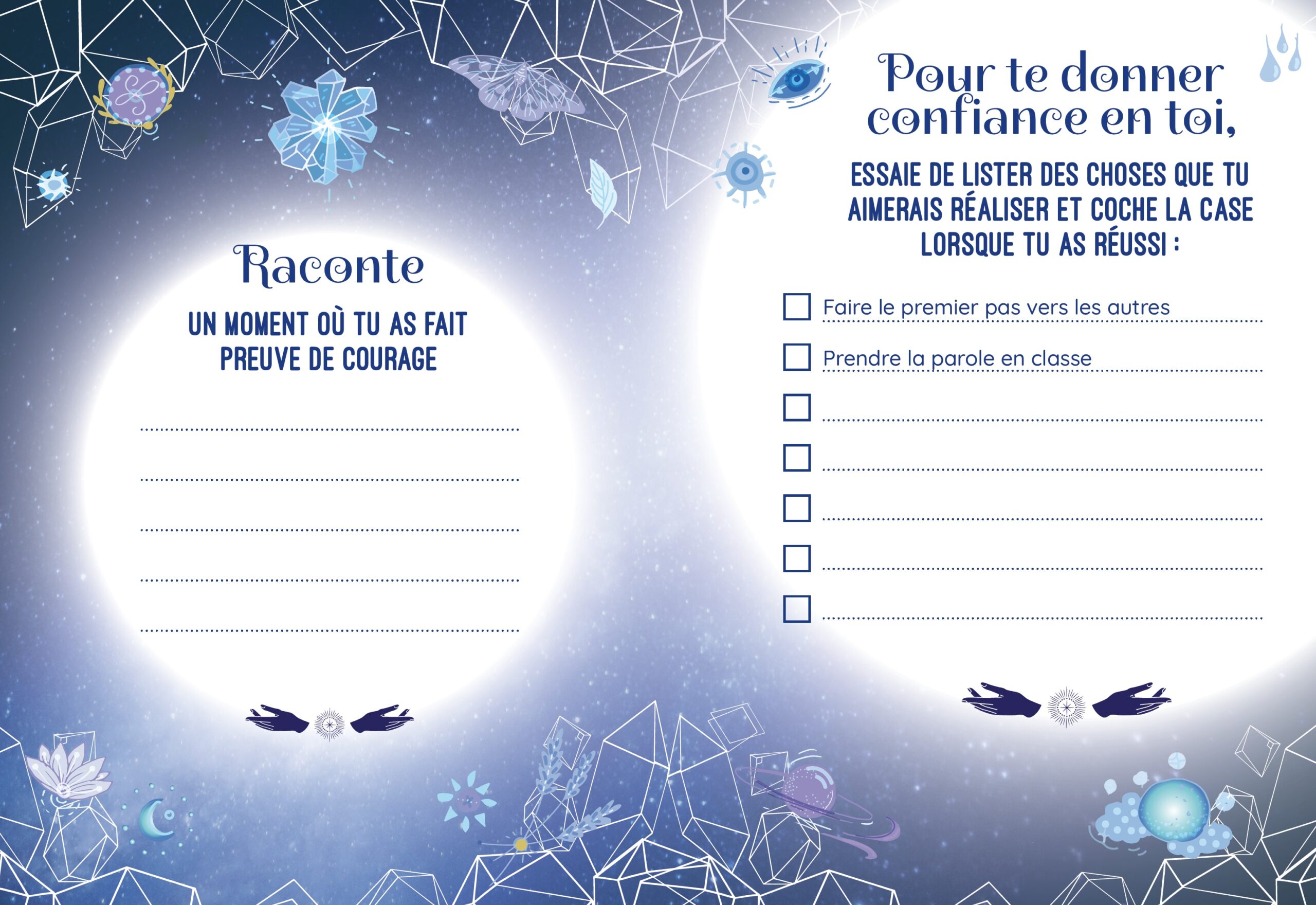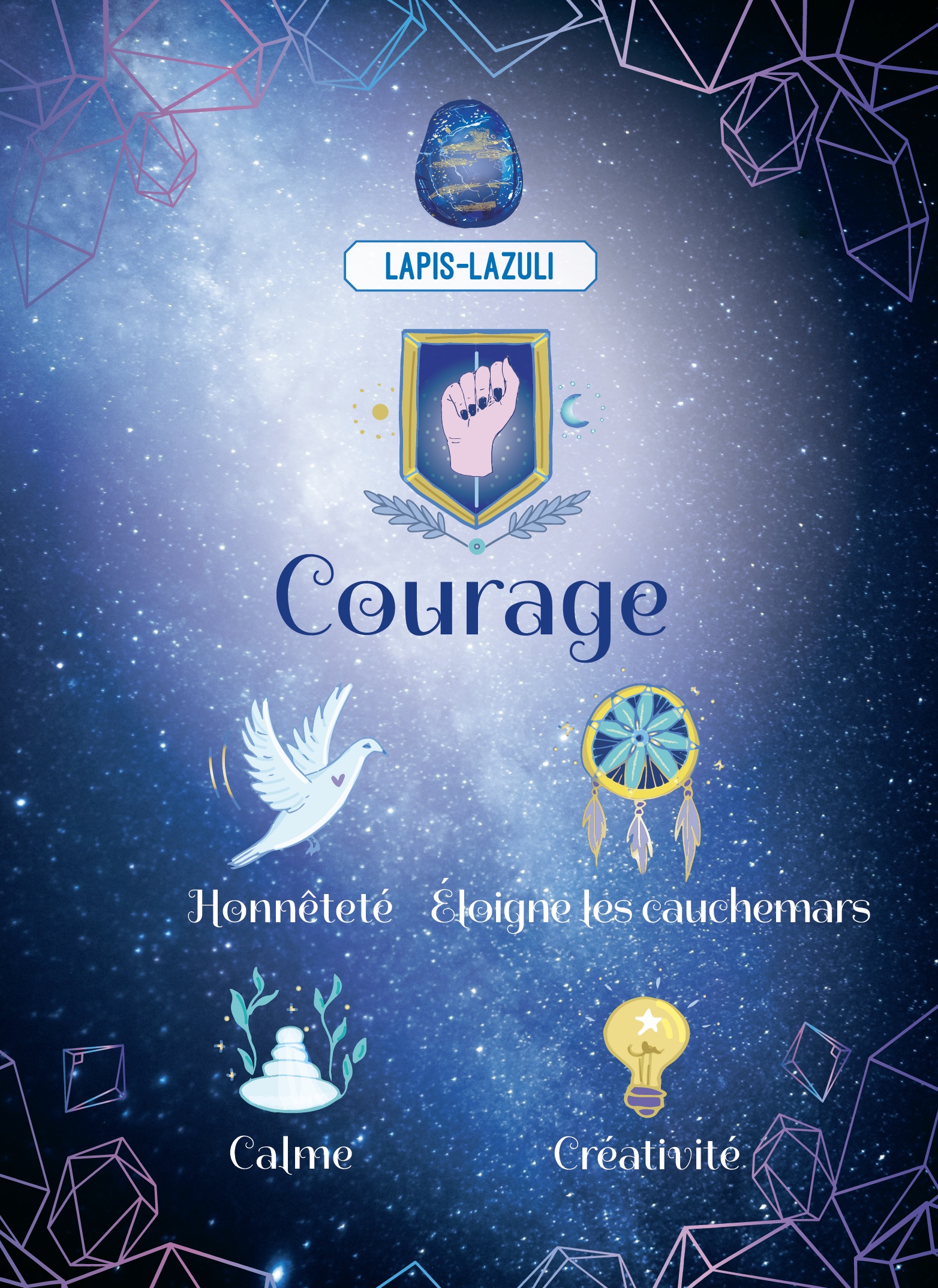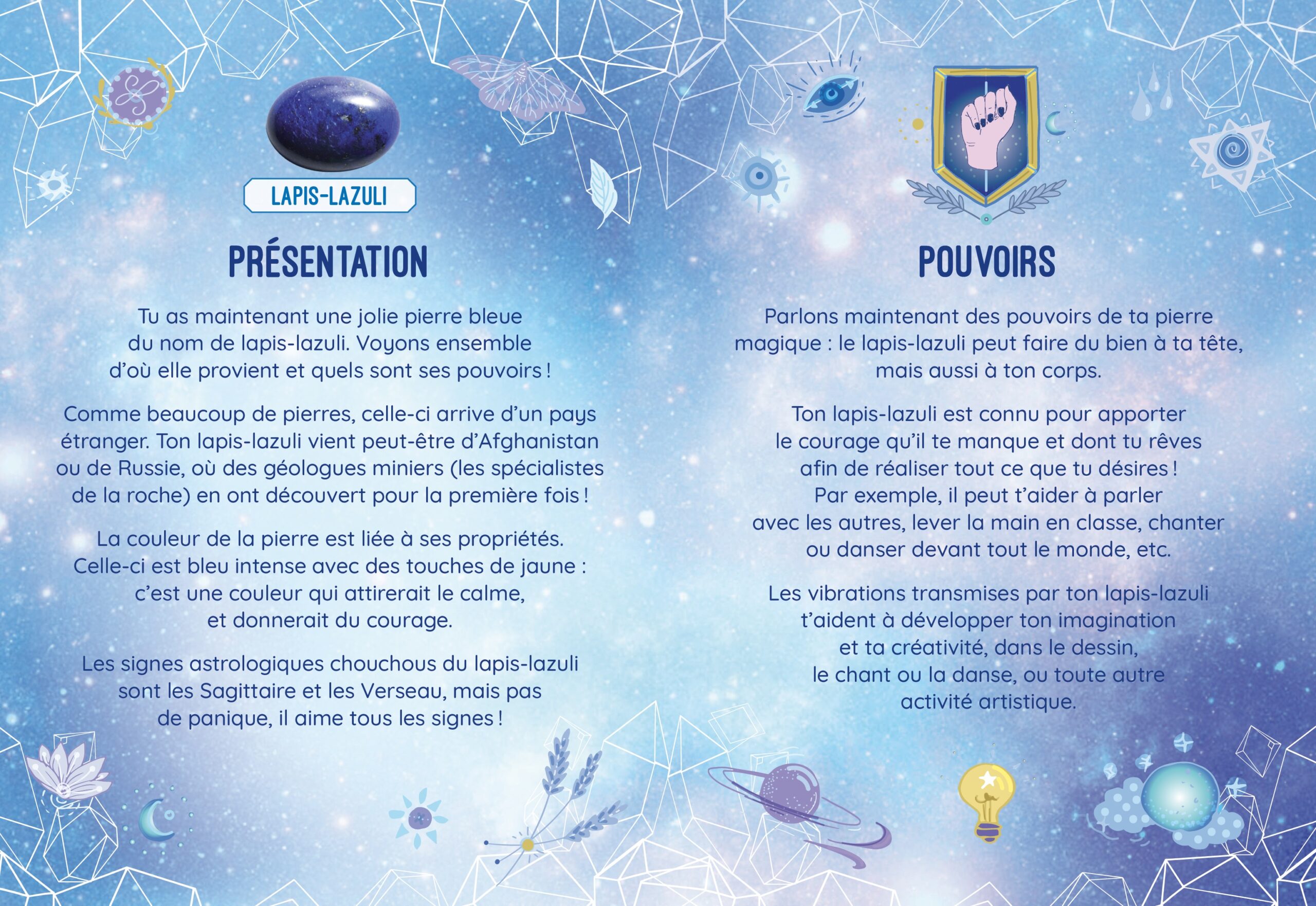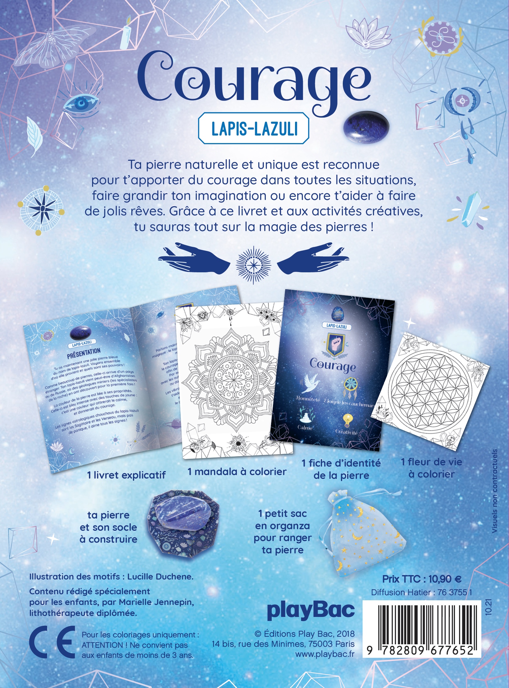 Découvre le pouvoir des pierres avec le lapis-lazuli ! Ta pierre unique et naturelle est reconnue pour t’apporter du courage dans toutes les situations, faire grandir ton imagination ou encore t’aider à faire de jolis rêves. Grâce à ton livret et aux activités créatives, tu sauras tout sur la magie des pierres ! Ce coffret contient : – 1 pierre véritable lapis-lazuli, unique et naturelle ; – 1 livret explicatif ; – 1 fiche d’identité de ta pierre avec ses vertus ; – 1 fleur de vie à colorier pour recharger le pouvoir de ta pierre ; – 1 mandala à colorier ; – 1 socle à construire ; – 1 sachet en organza pour ranger ta pierre. Contenu rédigé spécialement pour les enfants par une lithothérapeute diplômée.