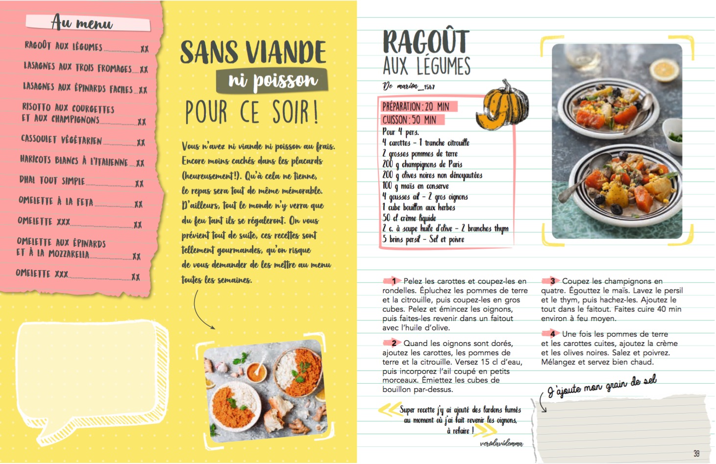 75 recettes de plats complets, 1 mois de menu, des infos et astuces pour gagner du temps… un cahier riche et complet, où chacun pourra ajouter son grain de sel en annotant ses propres remarques et expériences ! Retrouvez la cuisine familiale, facile et accessible du site de cuisine n°1 en France dans cette nouvelle collection de cahiers personnels.