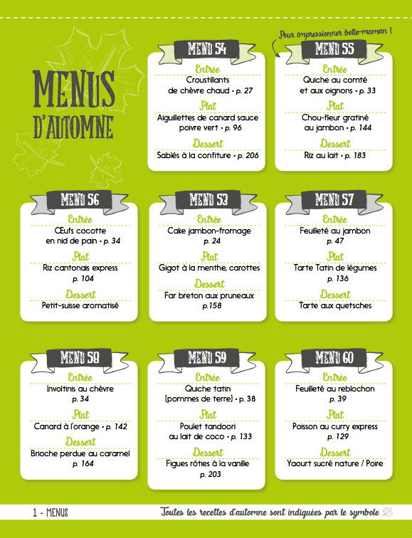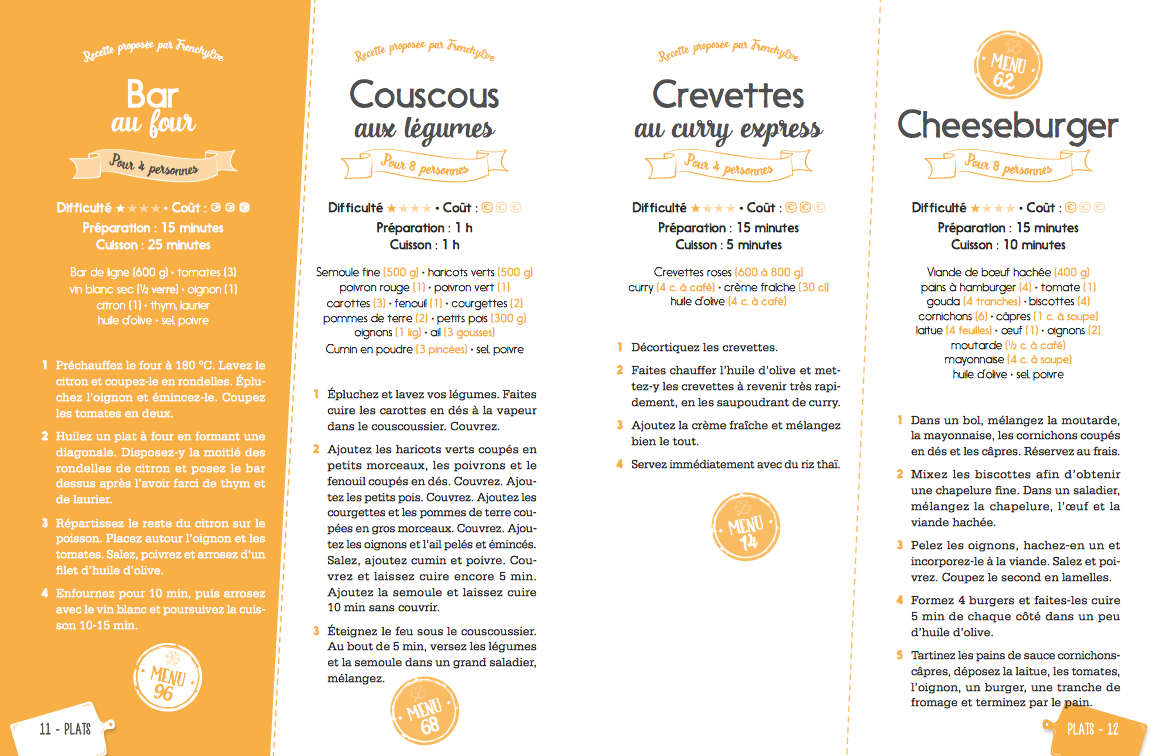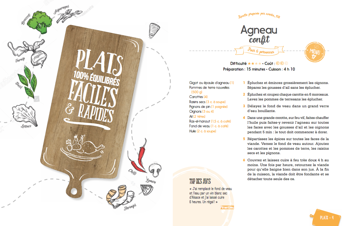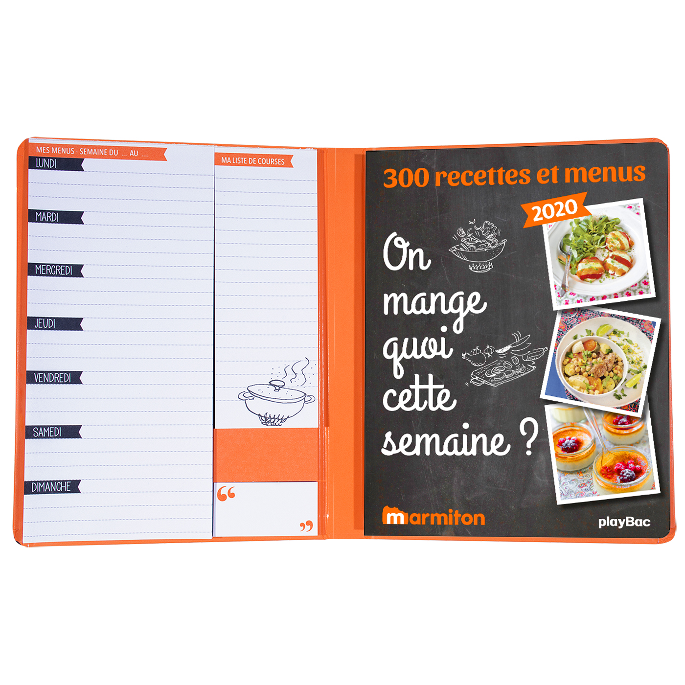Le premier livre de recettes avec son planificateur de menus intégré ! Plus de 300 menus et recettes organisés au fil des saisons pour s’inspirer et prévoir ses repas de l’année. En vis à vis, un bloc planificateur de menus pour tout anticiper du lundi au dimanche, une liste de courses et des notes repositionnables pour annoter ses envies ou commenter les recettes réalisées. L’INDISPENSABLE de tous les cuisiniers du quotidien !