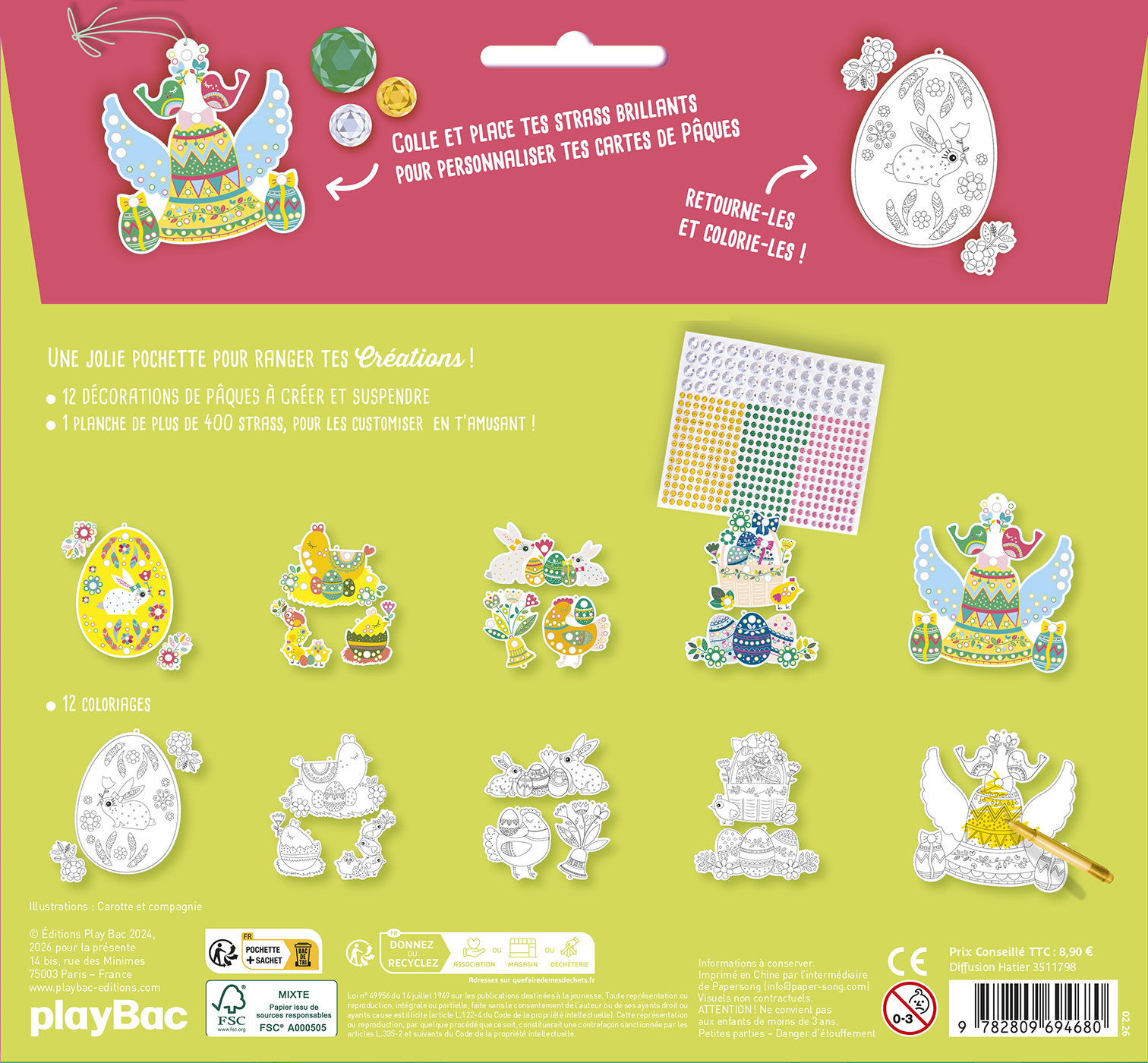 Dans cette pochette, l'enfant trouvera 5 cartes cartonnées à décorer avec plus de 350 strass sur le recto, et de jolis coloriages sur le verso.