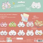 5 masques à décorer ou à colorier, une superbe planche de strass pour les personnaliser et une jolie pochette pour ranger tes créations.